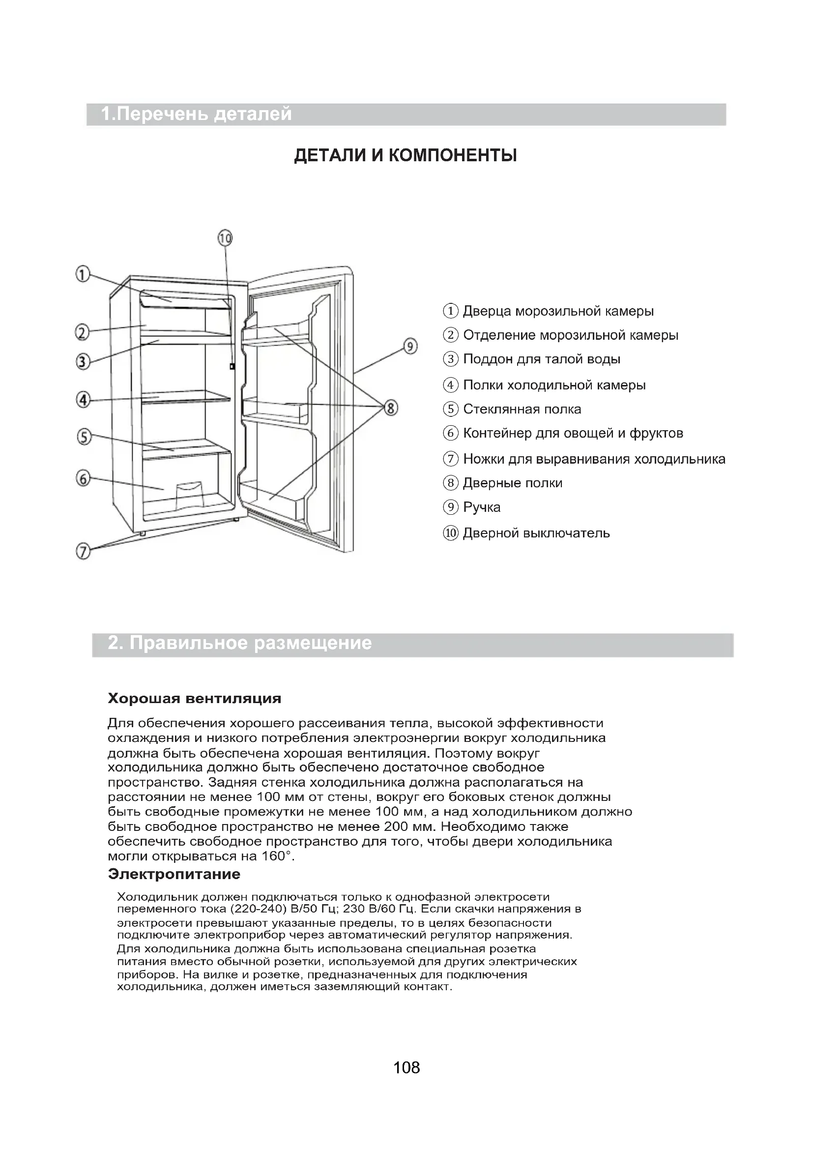 Детям запрещено играть с прибором. Детям без надлежащего присмотра запрещается выполнять отведенные пользователю операции очистки и обслуживания. 1061071.Перечень деталей ДЕТАЛИ И КОМПОНЕНТЫ ① Дверца морозильной камеры ② Отделение морозильной камеры ③ Поддон для талой воды ④ Полки холодильной камеры ⑤ Стеклянная полка ⑥ Контейнер для овощей и фруктов ⑦ Ножки для выравнивания холодильника ⑧ Дверные полки ⑨ Ручка ⑩ Дверной выключатель