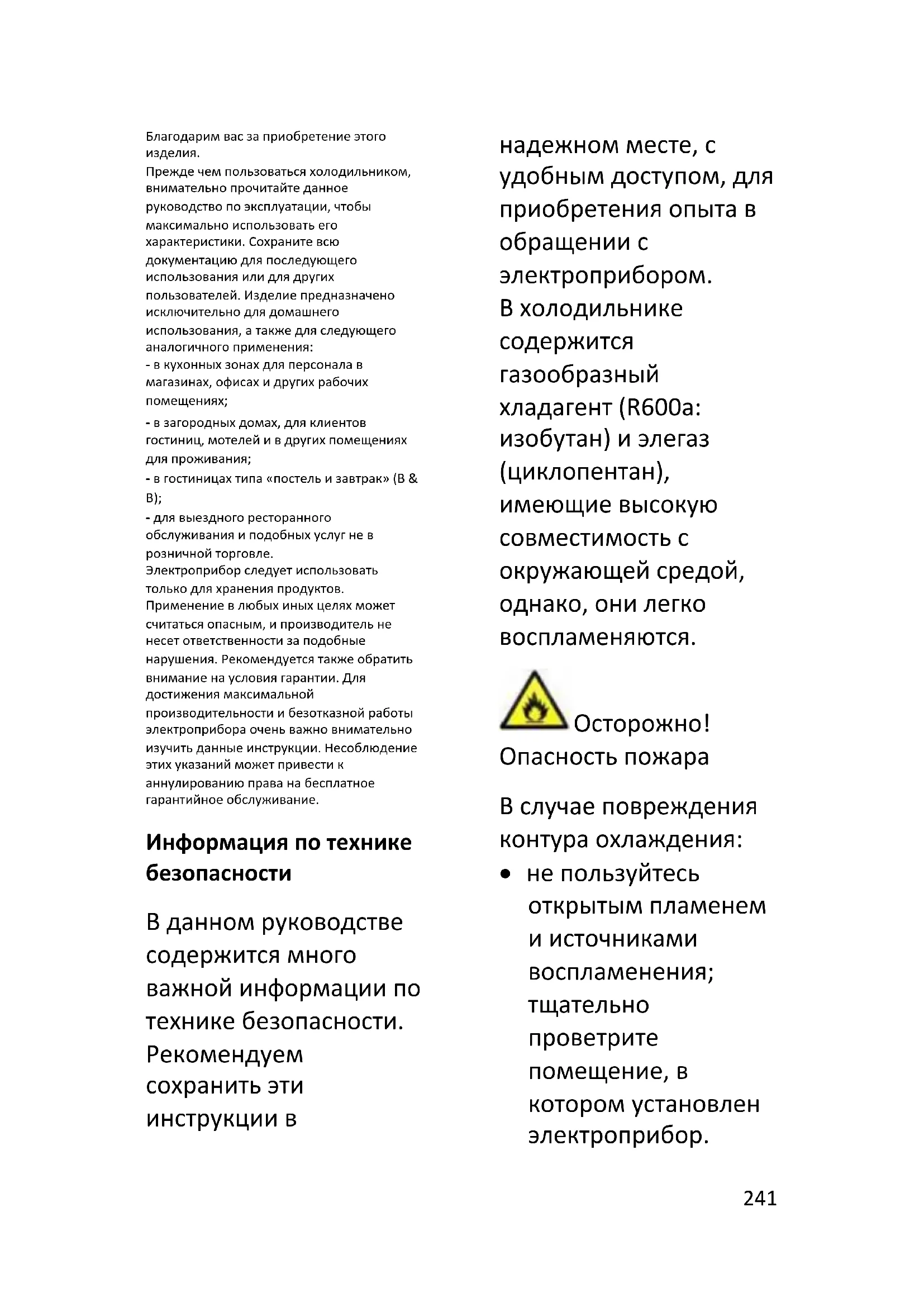 Прежде чем пользоваться холодильником, внимательно прочитайте данное руководство по эксплуатации, чтобы максимально использовать его характеристики. Сохраните всю документацию для последующего использования или для других пользователей. Изделие предназначено исключительно для домашнего использования, а также для следующего аналогичного применения: - в кухонных зонах для персонала в магазинах, офисах и других рабочих помещениях; - в загородных домах, для клиентов гостиниц, мотелей и в других помещениях для проживания; - в гостиницах типа «постель и завтрак» (B & B); - для выездного ресторанного обслуживания и подобных услуг не в розничной торговле. Электроприбор следует использовать только для хранения продуктов. Применение в любых иных целях может считаться опасным, и производитель не несет ответственности за подобные нарушения. Рекомендуется также обратить внимание на условия гарантии. Для достижения максимальной производительности и безотказной работы электроприбора очень важно внимательно изучить данные инструкции. Несоблюдение этих указаний может привести к аннулированию права на бесплатное гарантийное обслуживание. Информация по технике безопасности В данном руководстве содержится много важной информации по технике безопасности. Рекомендуем сохранить эти инструкции в надежном месте, с удобным доступом, для приобретения опыта в обращении с электроприбором. В холодильнике