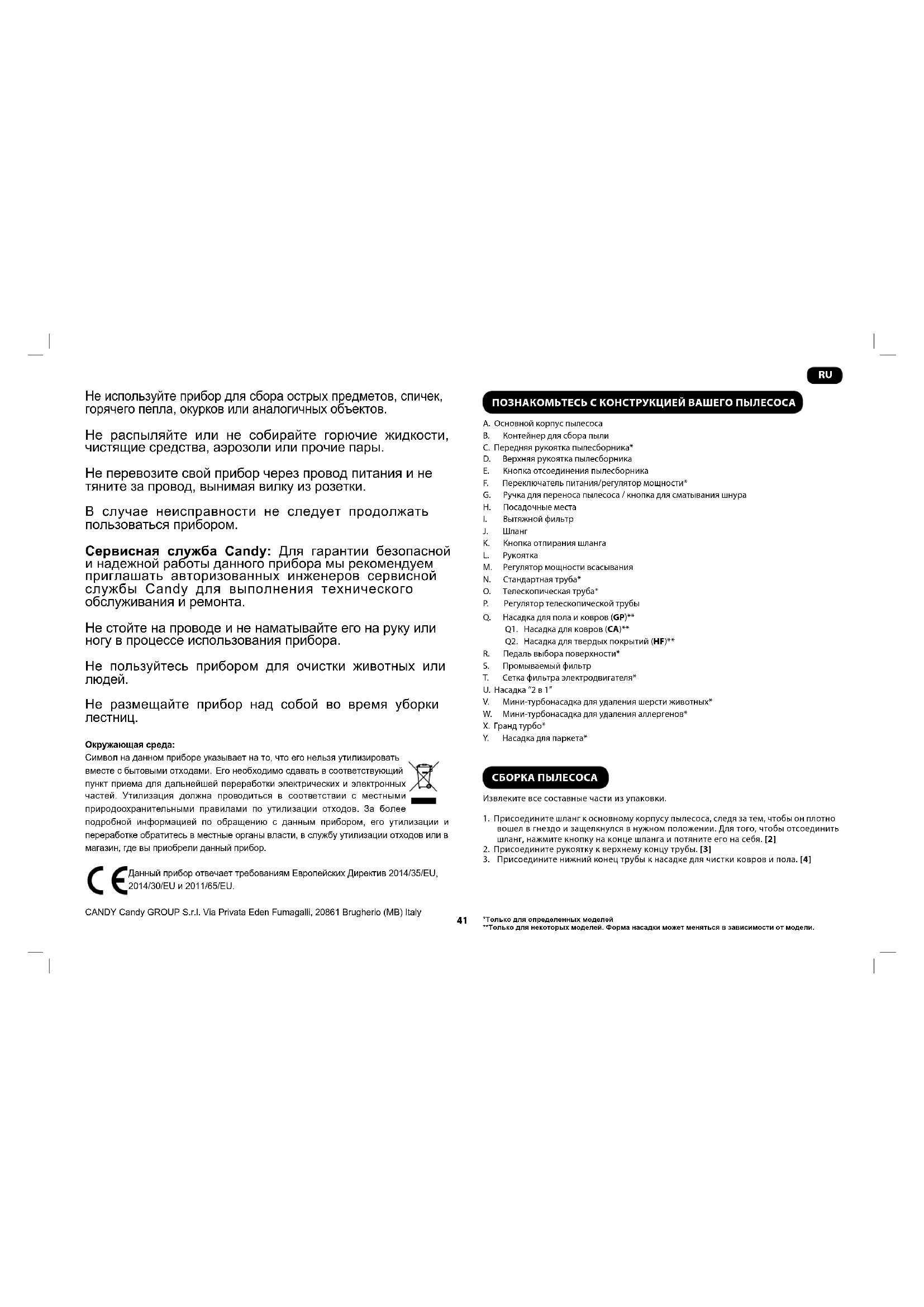 Если провод питания поврежден, немедленно отключите прибор. Во избежание угрозы безопасности замену провода питания должен проводить авторизованный инженер сервисной службы Candy. Не приближайте вращающиеся щетки к рукам, ногам, болтающейся одежде и волосам. Используйте только те насадки, расходные материалы или запасные части, которые рекомендует или поставляет Candy. Статическое электричество: Некоторые типы ковровых покрытий способны накапливать небольшой заряд статического электричества. Разряд статического электричества не представляет опасности для здоровья. Не применяйте прибор вне помещений, на влажных поверхностях или для сбора жидкостей.41