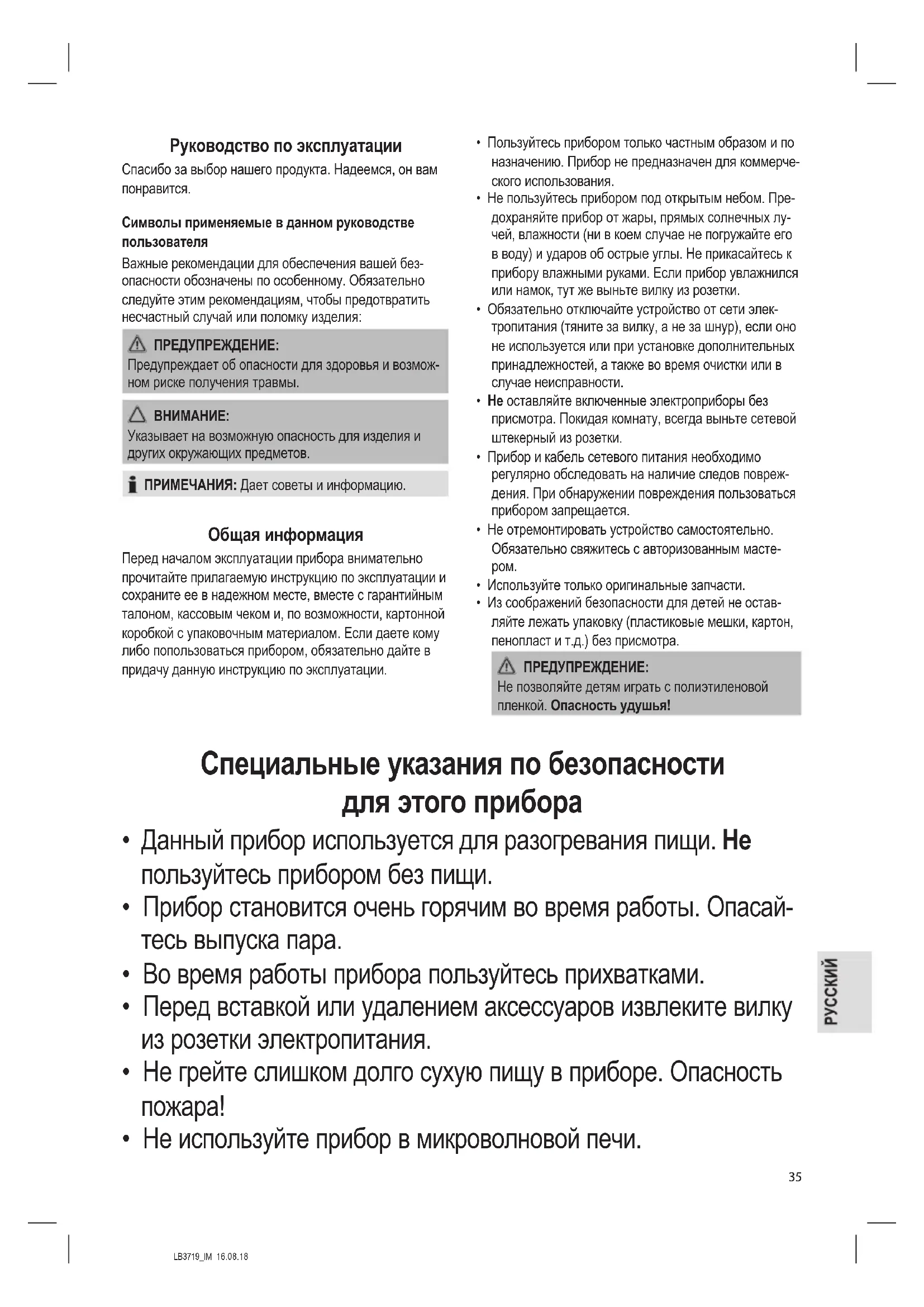 - Из соображений безопасности для детей не остав- ляйте лежать упаковку (пластиковые мешки, картон, пенопласт и т.д.) без присмотра. ПРЕДУПРЕЖДЕНИЕ: Не позволяйте детям играть с полиэтиленовой пленкой. Опасность удушья! Специальные указания по безопасности для этого прибора