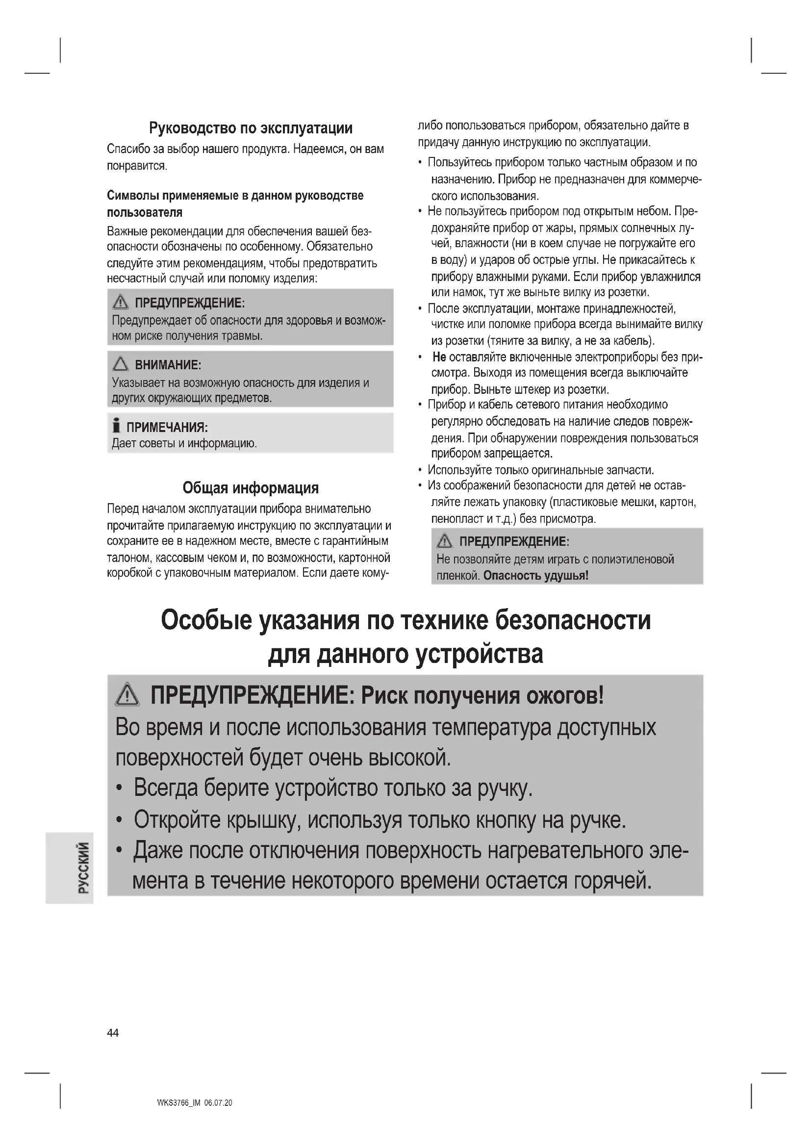 - Из соображений безопасности для детей не остав- ляйте лежать упаковку (пластиковые мешки, картон, пенопласт и т.д.) без присмотра. ПРЕДУПРЕЖДЕНИЕ: Не позволяйте детям играть с полиэтиленовой пленкой. Опасность удушья! Особые указания по технике безопасности для данного устройства ПРЕДУПРЕЖДЕНИЕ: Риск получения ожогов! Во время и после использования температура доступных поверхностей будет очень высокой.