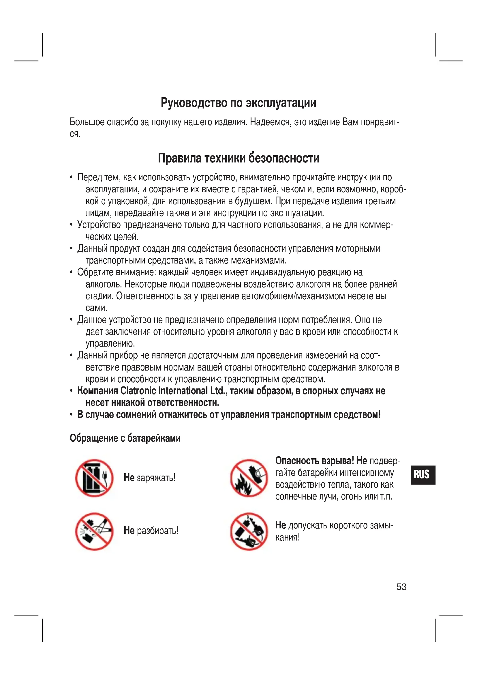 - Не модифицируйте тестер, это может вызвать неисправности.58 RUS Технические данные датчик: ...................................................................... Тестер продуктов окисления алкоголя Диапазон измерений: .....................................................................0,0 ‰ – 1,9 ‰ промилле Погрешность: ...............................................................................................................+/- 0,1% Электропитание: .............................................................батареи 2 х 1,5V AAA • UM-4 • R03 Время работы подготовка: ......................................10 секунд, результат через: <5 секунд Автоматической выключение: ................................................................... прибл. 40 секунд Вес нетто: ...........................................................................................................прибл. 0,36 кг Сохранено право на технические и конструкционные изменения в рамках продолжа