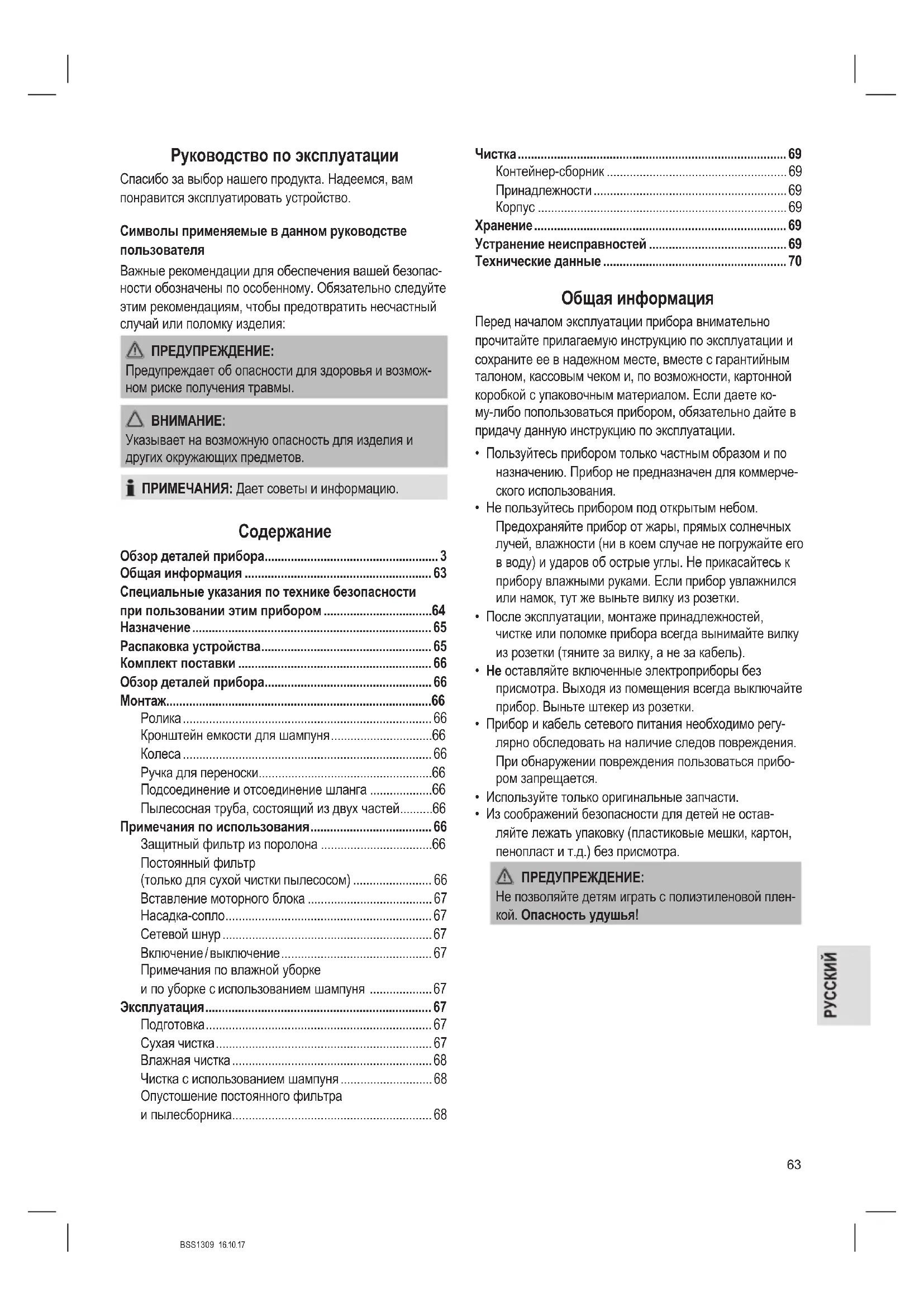 комплекта поставки, не используйте прибор. Немед- ленно верните его дилеру. ПРИМЕЧАНИЯ: На устройстве все еще могут оставаться мелкие частицы и пыль, оставшиеся после производственного процесса. Рекомендуется почистить устройство, как описано в разделе “Чистка”.BSS1309 16.10.17