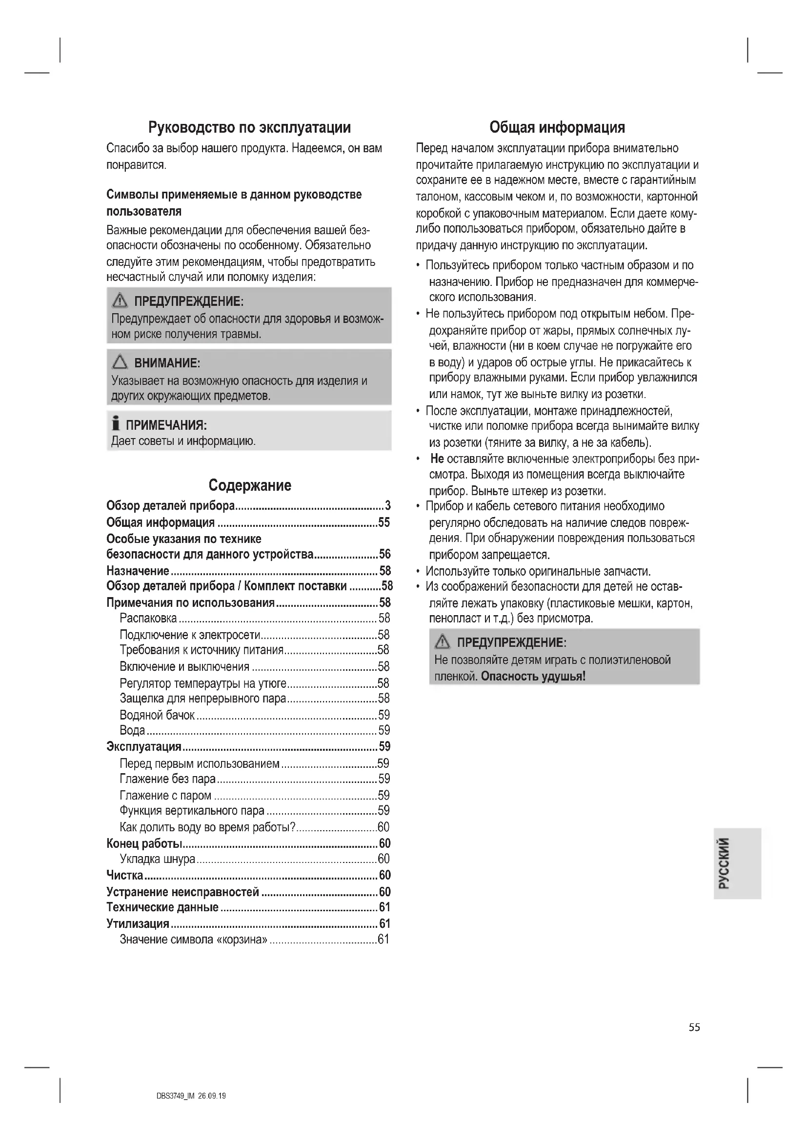 - Из соображений безопасности для детей не остав- ляйте лежать упаковку (пластиковые мешки, картон, пенопласт и т.д.) без присмотра. ПРЕДУПРЕЖДЕНИЕ: Не позволяйте детям играть с полиэтиленовой пленкой. Опасность удушья!DBS3749_IM 26.09.19