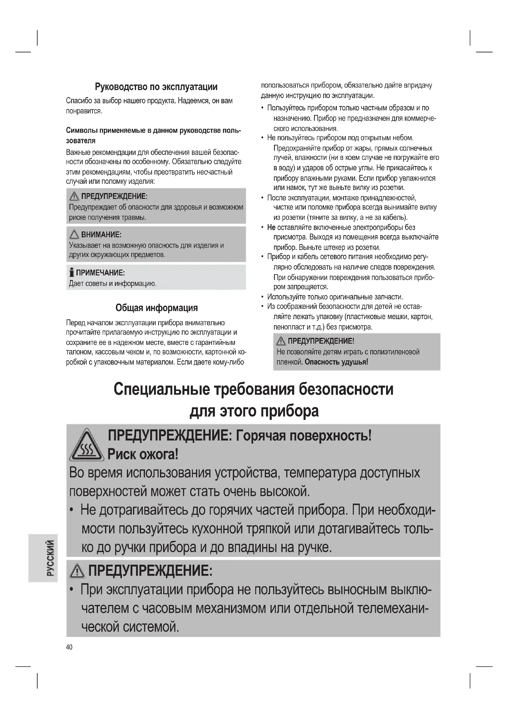 - Из соображений безопасности для детей не остав- ляйте лежать упаковку (пластиковые мешки, картон, пенопласт и т.д.) без присмотра. ПРЕДУПРЕЖДЕНИЕ! Не позволяйте детям играть с полиэтиленовой пленкой. Опасность удушья! Специальные требования безопасности для этого прибора ПРЕДУПРЕЖДЕНИЕ: Горячая поверхность! Риск ожога! Во время использования устройства, температура доступных поверхностей может стать очень высокой.