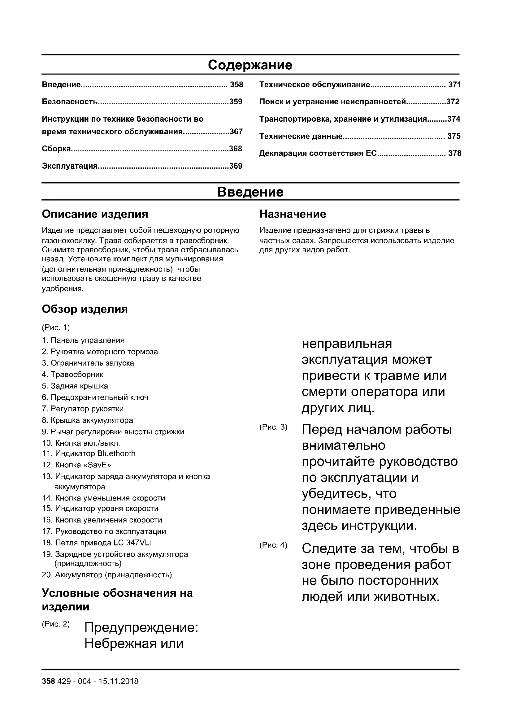 (Pис. 2) Предупреждение: Небрежная или неправильная эксплуатация может привести к травме или смерти оператора или других лиц. (Pис. 3) Перед началом работы внимательно прочитайте руководство по эксплуатации и убедитесь, что понимаете приведенные здесь инструкции. (Pис. 4) Следите за тем, чтобы в зоне проведения работ не было посторонних людей или животных. 358 429 - 004 - 15.11.2018(Pис. 5)