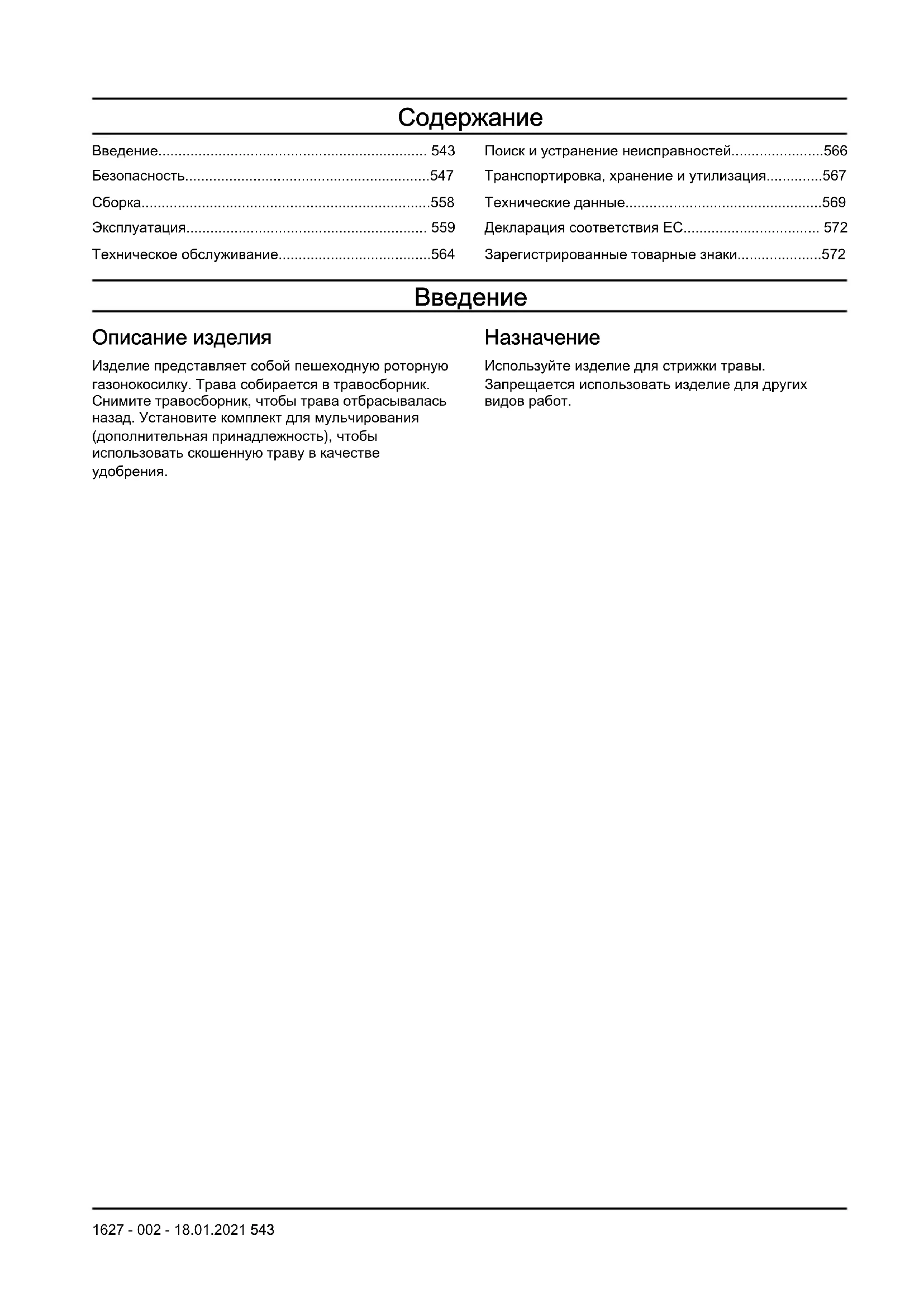 Используйте изделие для стрижки травы. Запрещается использовать изделие для других видов работ. 1627 - 002 - 18.01.2021 543Обзор изделия