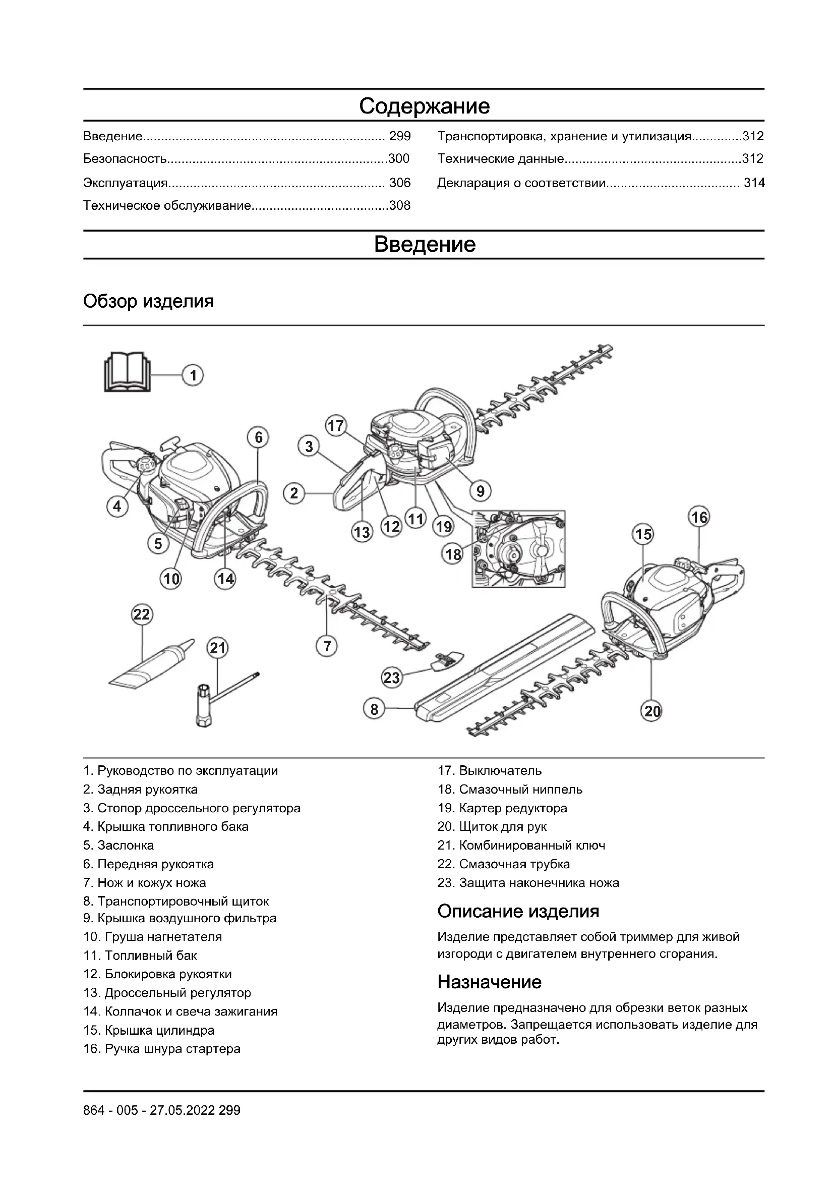 Описание изделия Изделие представляет собой триммер для живой изгороди с двигателем внутреннего сгорания.