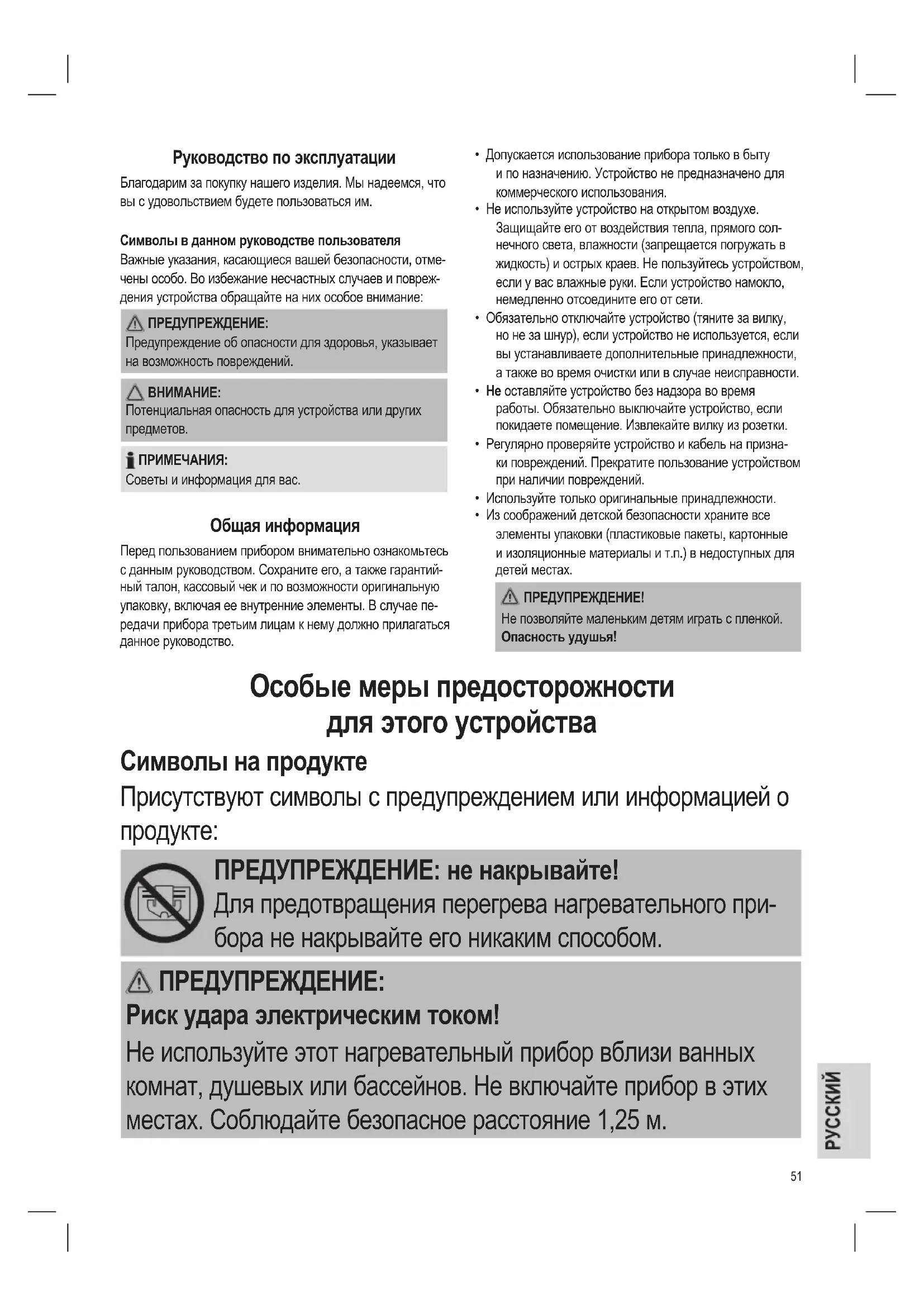 ПРЕДУПРЕЖДЕНИЕ: не накрывайте! Для предотвращения перегрева нагревательного при- бора не накрывайте его никаким способом. ПРЕДУПРЕЖДЕНИЕ: Риск удара электрическим током! Не используйте этот нагревательный прибор вблизи ванных комнат, душевых или бассейнов. Не включайте прибор в этих местах. Соблюдайте безопасное расстояние 1,25 м.52 ПРЕДУПРЕЖДЕНИЕ: Риск возгорания