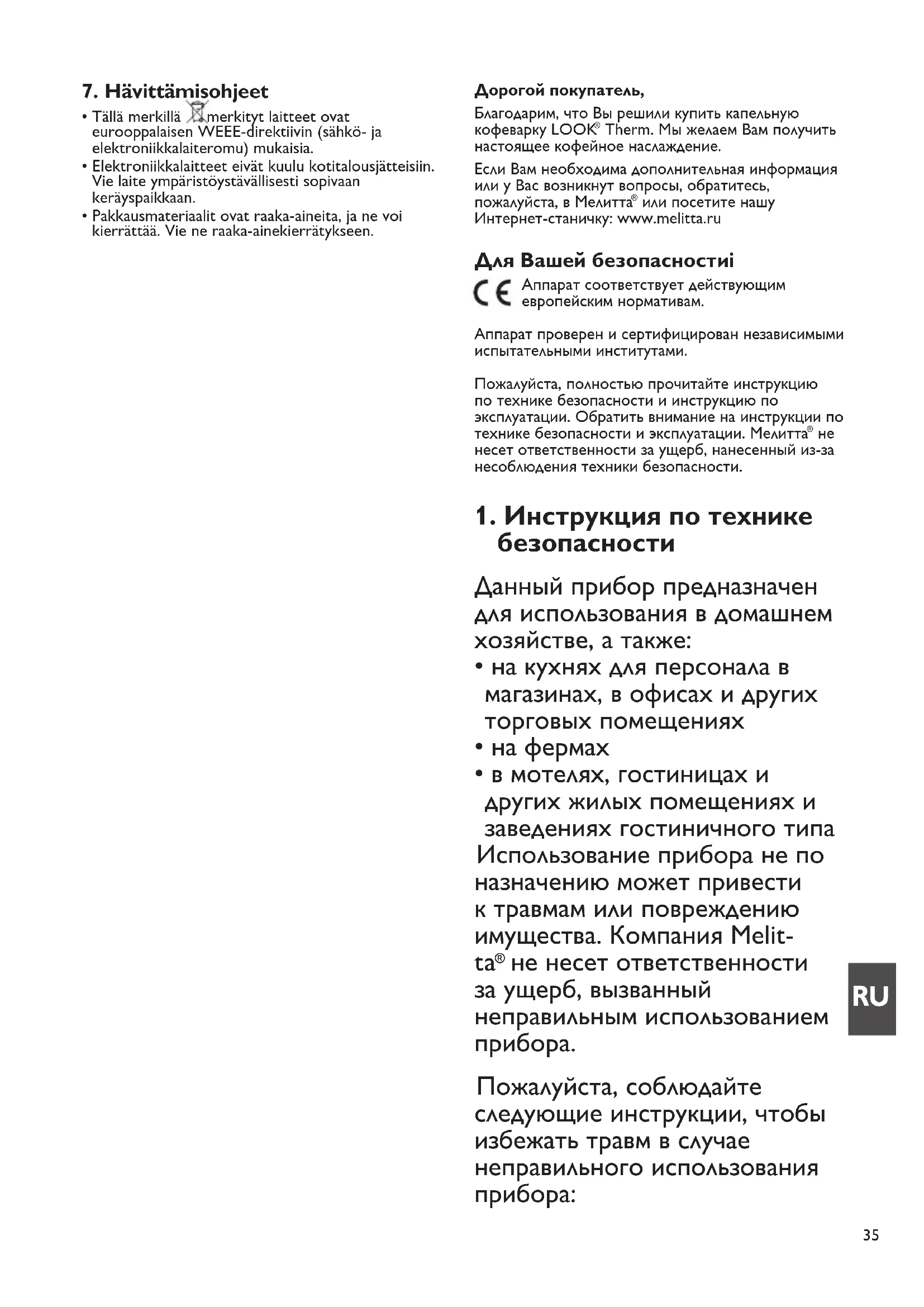 или посетите нашу Интернет-станичку: www.melitta.ru Для Вашей безопасностиi