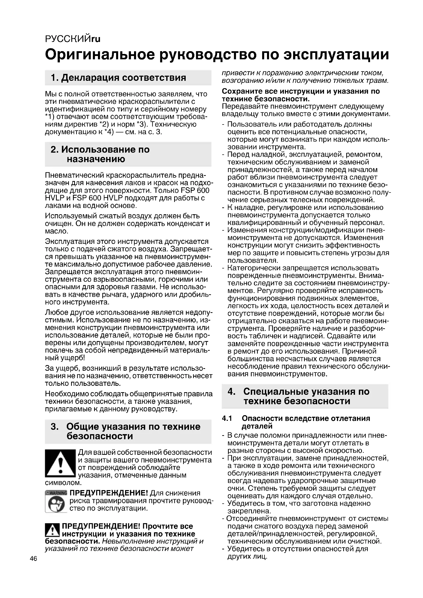 Оригинальное руководство по эксплуатации Мы с полной ответственностью заявляем, что эти пневматические краскораспылители с идентификацией по типу и серийному номеру *1) отвечают всем соответствующим требова- ниям директив *2) и норм *3). Техническую документацию к *4) — см. на с. 3. Пневматический краскораспылитель предна- значен для нанесения лаков и красок на подхо- дящие для этого поверхности. Только FSP 600 HVLP и FSP 600 HVLP подходят для работы