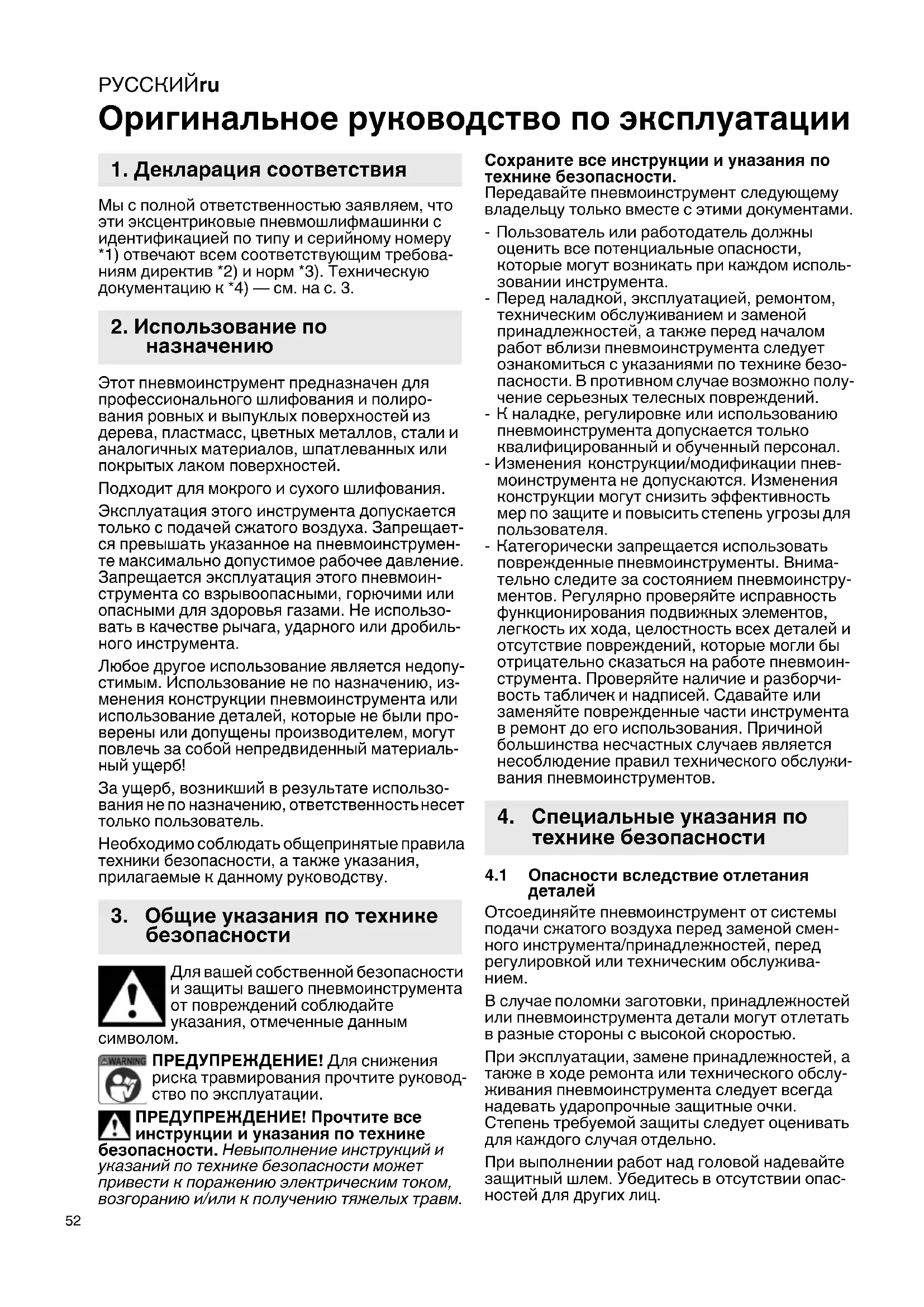 ПРЕДУПРЕЖДЕНИЕ! Для снижения риска травмирования прочтите руковод- ство по эксплуатации. ПРЕДУПРЕЖДЕНИЕ! Прочтите все инструкции и указания по технике безопасности. Невыполнение инструкций и указаний по технике безопасности может привести к поражению электрическим током, возгоранию и/или к получению тяжелых травм. Сохраните все инструкции и указания по технике безопасности. Передавайте пневмоинструмент следующему владельцу только вместе с этими документами. - Пользователь или работодатель должны оценить все потенциальные опасности, которые могут возникать при каждом