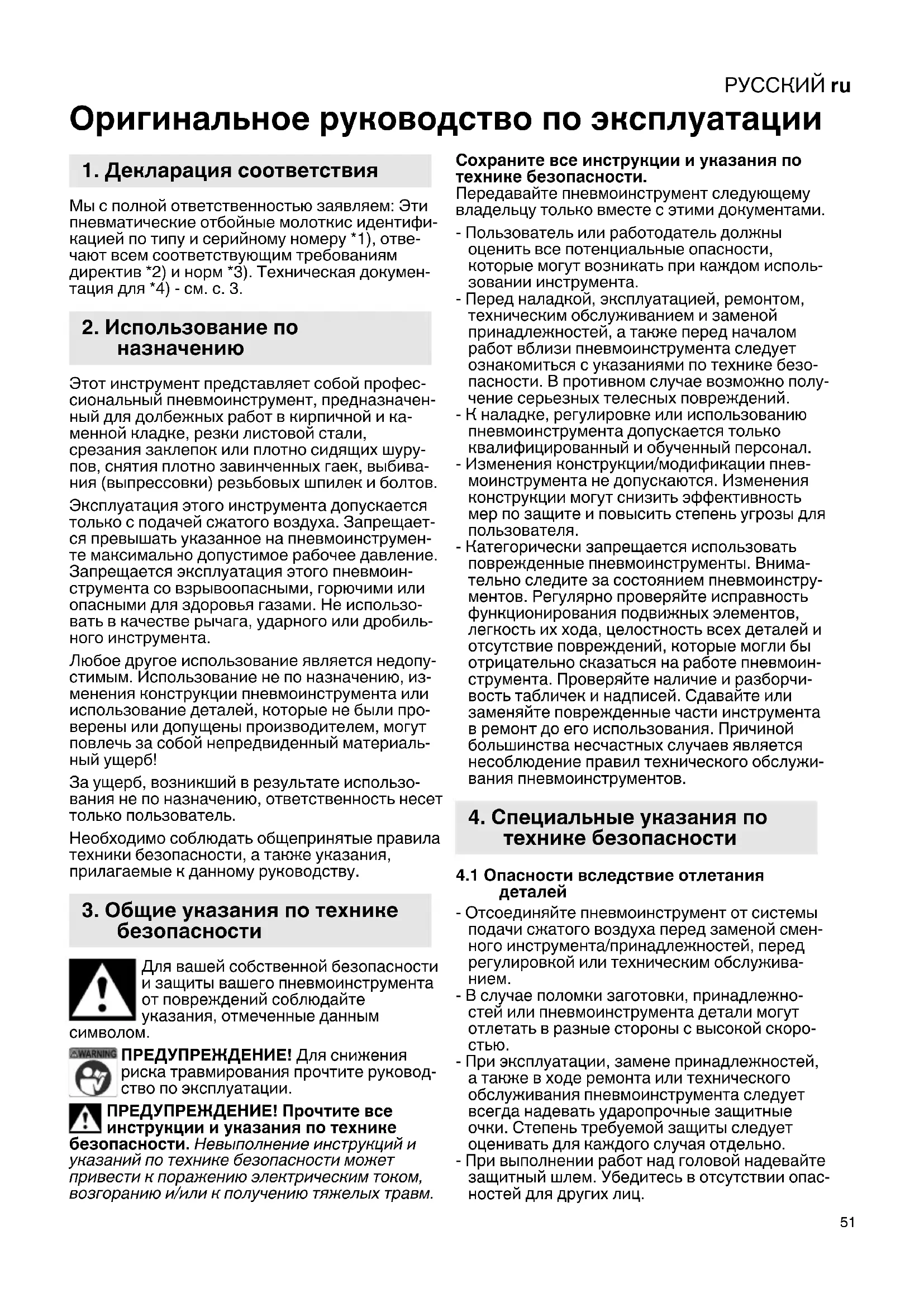 Оригинальное руководство по эксплуатации Мы с полной ответственностью заявляем: Эти пневматические отбойные молоткис идентифи- кацией по типу и серийному номеру *1), отве- чают всем соответствующим требованиям директив *2) и норм *3). Техническая докумен- тация для *4) - см. с. 3. Этот инструмент представляет собой профес- сиональный пневмоинструмент, предназначен- ный для долбежных работ в кирпичной и ка- менной кладке, резки листовой стали, срезания заклепок или плотно сидящих шуру- пов, снятия плотно завинченных гаек, выбива- ния (выпрессовки) резьбовых шпилек и болтов. Эксплуатация этого инструмента допускается только с подачей сжатого воздуха. Запрещает- ся превышать указанное на пневмоинструмен- те максимально допустимое рабочее давление. Запрещается эксплуатация этого пневмоин- струмента со взрывоопасными, горючими или опасными для здоровья газами. Не использо- вать в качестве рычага, ударного или дробиль- ного инструмента. Любое другое использование является недопу- стимым. Использование не по назначению, из- менения конструкции пневмоинструмента или использование деталей, которые не были про- верены или допущены производителем, могут повлечь за собой непредвиденный материаль-