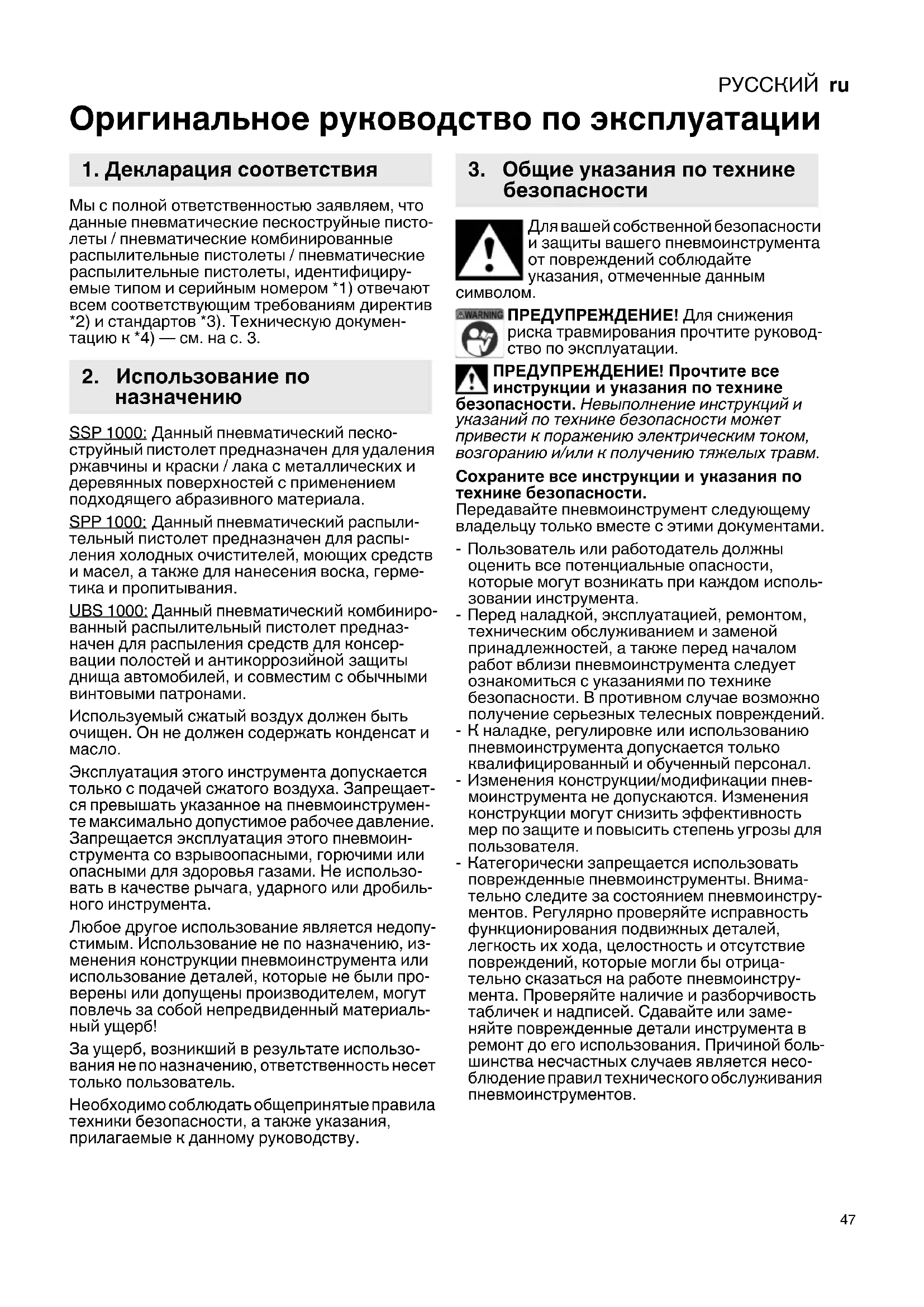 Оригинальное руководство по эксплуатации Мы с полной ответственностью заявляем, что данные пневматические пескоструйные писто- леты / пневматические комбинированные распылительные пистолеты / пневматические распылительные пистолеты, идентифициру- емые типом и серийным номером *1) отвечают всем соответствующим требованиям директив *2) и стандартов *3). Техническую докумен- тацию к *4) — см. на с. 3. SSP 1000: Данный пневматический песко- струйный пистолет предназначен для удаления ржавчины и краски / лака с металлических и деревянных поверхностей с применением подходящего абразивного материала. SPP 1000: Данный пневматический распыли- тельный пистолет предназначен для распы- ления холодных очистителей, моющих средств и масел, а также для нанесения воска, герме- тика и пропитывания. UBS 1000: Данный пневматический комбиниро- ванный распылительный пистолет предназ- начен для распыления средств для консер- вации полостей и антикоррозийной защиты днища автомобилей, и совместим с обычными винтовыми патронами. Используемый сжатый воздух должен быть очищен. Он не должен содержать конденсат и