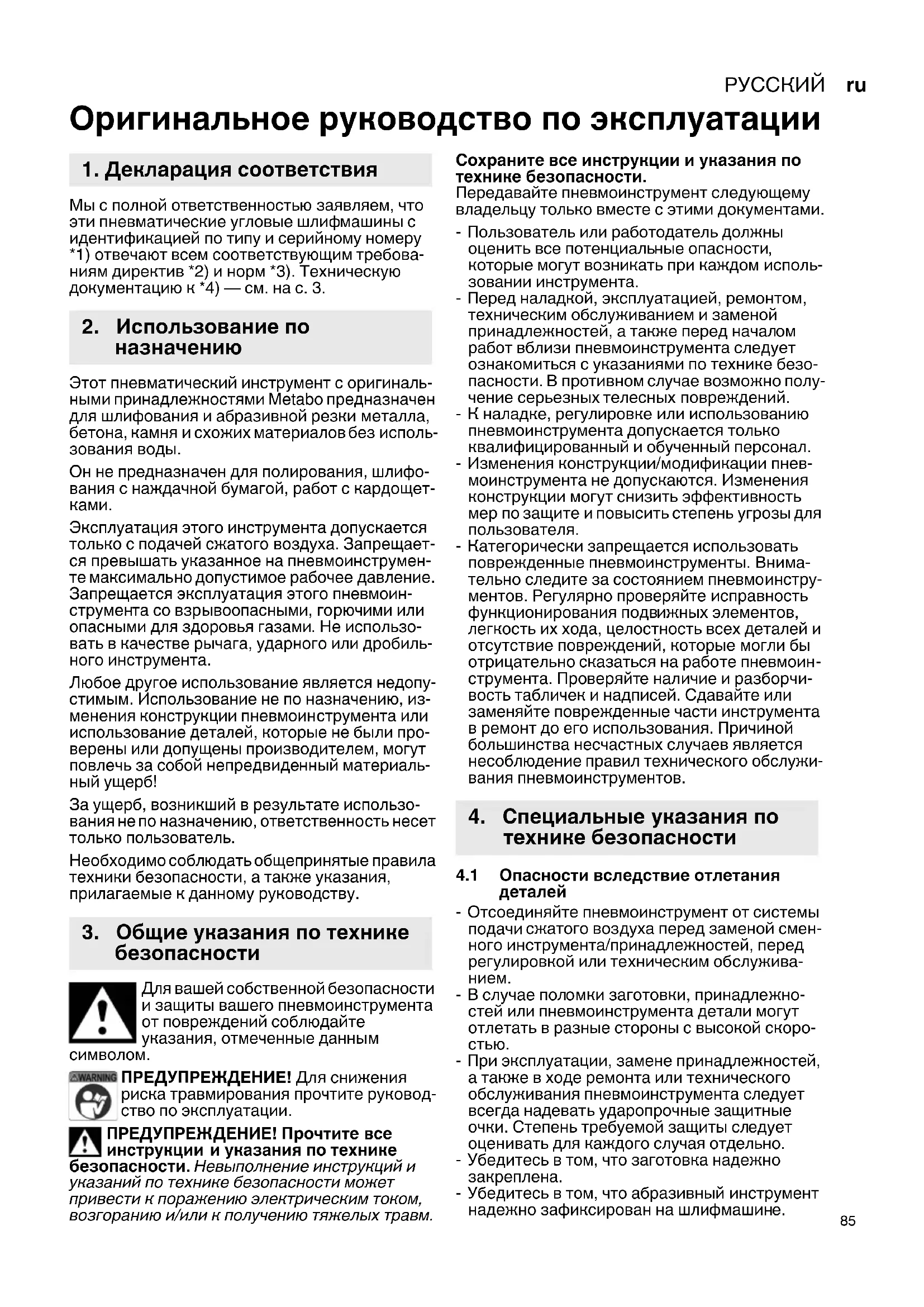 Оригинальное руководство по эксплуатации Мы с полной ответственностью заявляем, что эти пневматические угловые шлифмашины с идентификацией по типу и серийному номеру *1) отвечают всем соответствующим требова- ниям директив *2) и норм *3). Техническую документацию к *4) — см. на с. 3. Этот пневматический инструмент с оригиналь- ными принадлежностями Metabo предназначен для шлифования и абразивной резки металла, бетона, камня и схожих материалов без исполь- зования воды. Он не предназначен для полирования, шлифо- вания с наждачной бумагой, работ с кардощет-