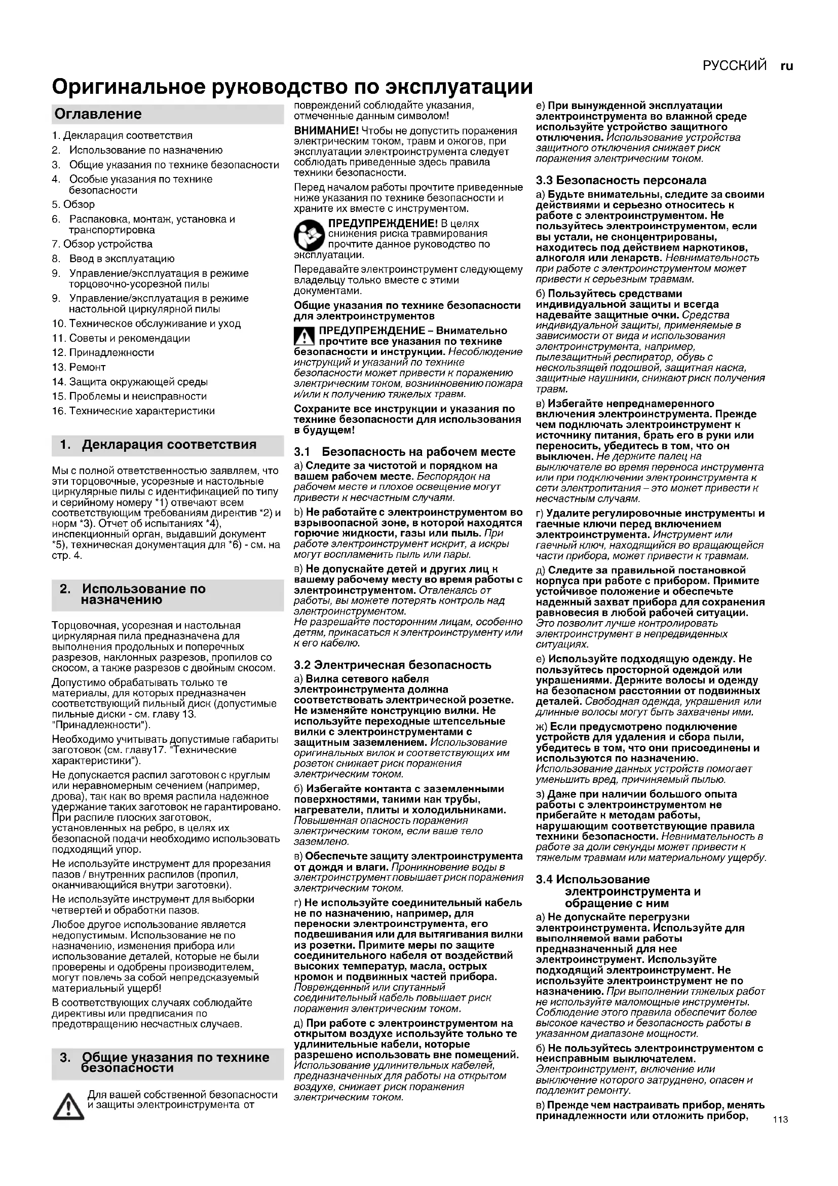 Мы с полной ответственностью заявляем, что эти торцовочные, усорезные и настольные циркулярные пилы с идентификацией по типу и серийному номеру *1) отвечают всем соответствующим требованиям директив *2) и норм *3). Отчет об испытаниях *4), инспекционный орган, выдавший документ *5), техническая документация для *6) - см. на стр. 4. Торцовочная, усорезная и настольная циркулярная пила предназначена для выполнения продольных и поперечных разрезов, наклонных разрезов, пропилов со скосом, а также разрезов с двойным скосом. Допустимо обрабатывать только те материалы, для которых предназначен соответствующий пильный диск (допустимые пильные диски - см. главу 13. "Принадлежности"). Необходимо учитывать допустимые габариты заготовок (см. главу17. "Технические характеристики"). Не допускается распил заготовок