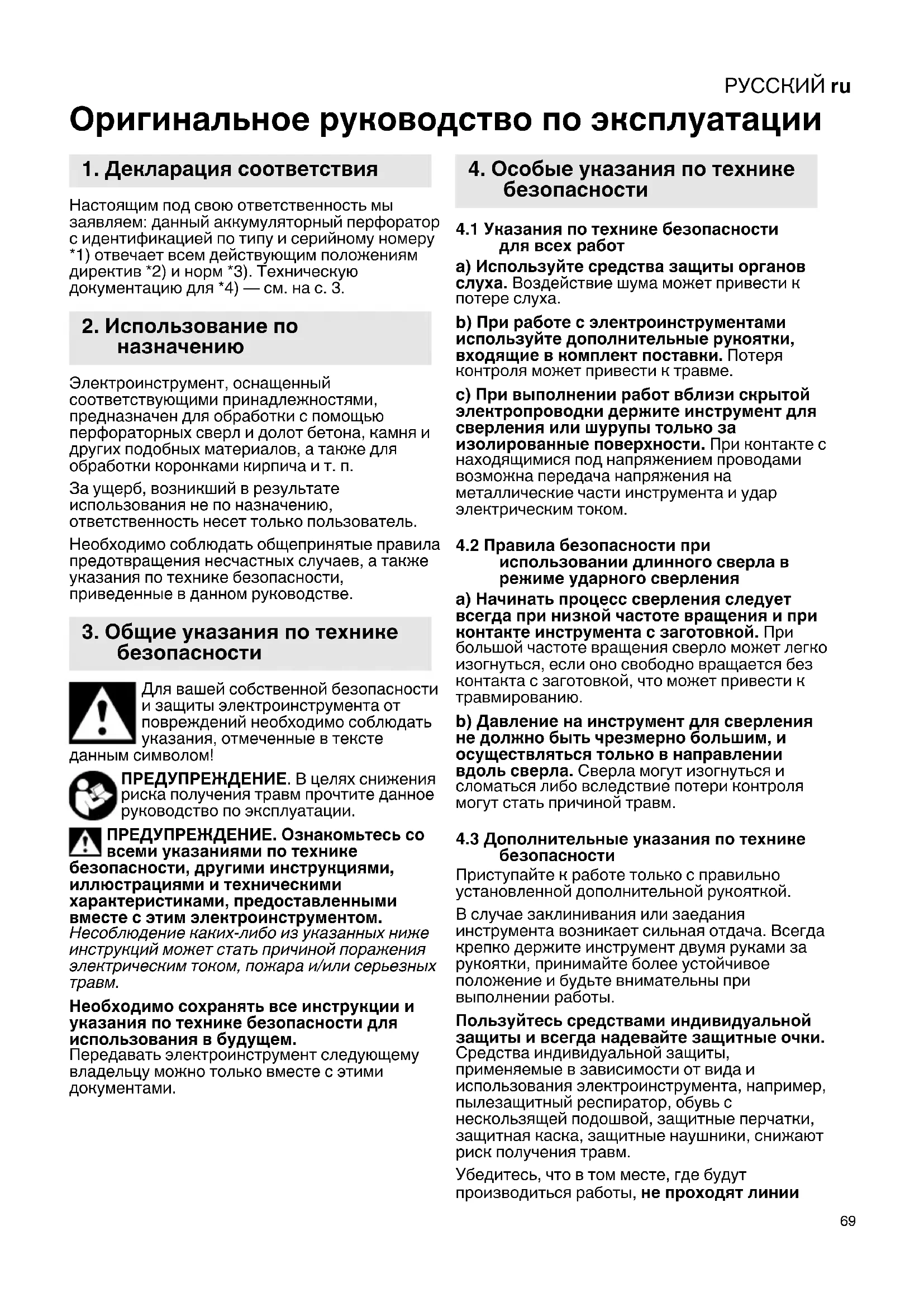 Оригинальное руководство по эксплуатации Настоящим под свою ответственность мы заявляем: данный аккумуляторный перфоратор с идентификацией по типу и серийному номеру *1) отвечает всем действующим положениям директив *2) и норм *3). Техническую документацию для *4) — см. на с. 3. Электроинструмент, оснащенный соответствующими принадлежностями, предназначен для обработки с помощью перфораторных сверл и долот бетона, камня и других подобных материалов, а также для обработки коронками кирпича и т. п. За ущерб, возникший в результате использования не по назначению, ответственность несет только пользователь. Необходимо соблюдать общепринятые правила предотвращения несчастных случаев, а также указания по технике безопасности, приведенные в данном руководстве. Для вашей собственной безопасности и защиты электроинструмента от повреждений необходимо соблюдать указания, отмеченные в тексте данным символом! ПРЕДУПРЕЖДЕНИЕ. В целях снижения риска получения травм прочтите данное руководство по эксплуатации. ПРЕДУПРЕЖДЕНИЕ. Ознакомьтесь со всеми указаниями по технике безопасности, другими инструкциями, иллюстрациями и техническими характеристиками, предоставленными вместе с этим электроинструментом. Несоблюдение каких-либо из указанных ниже инструкций может стать причиной поражения электрическим током, пожара и/или серьезных
