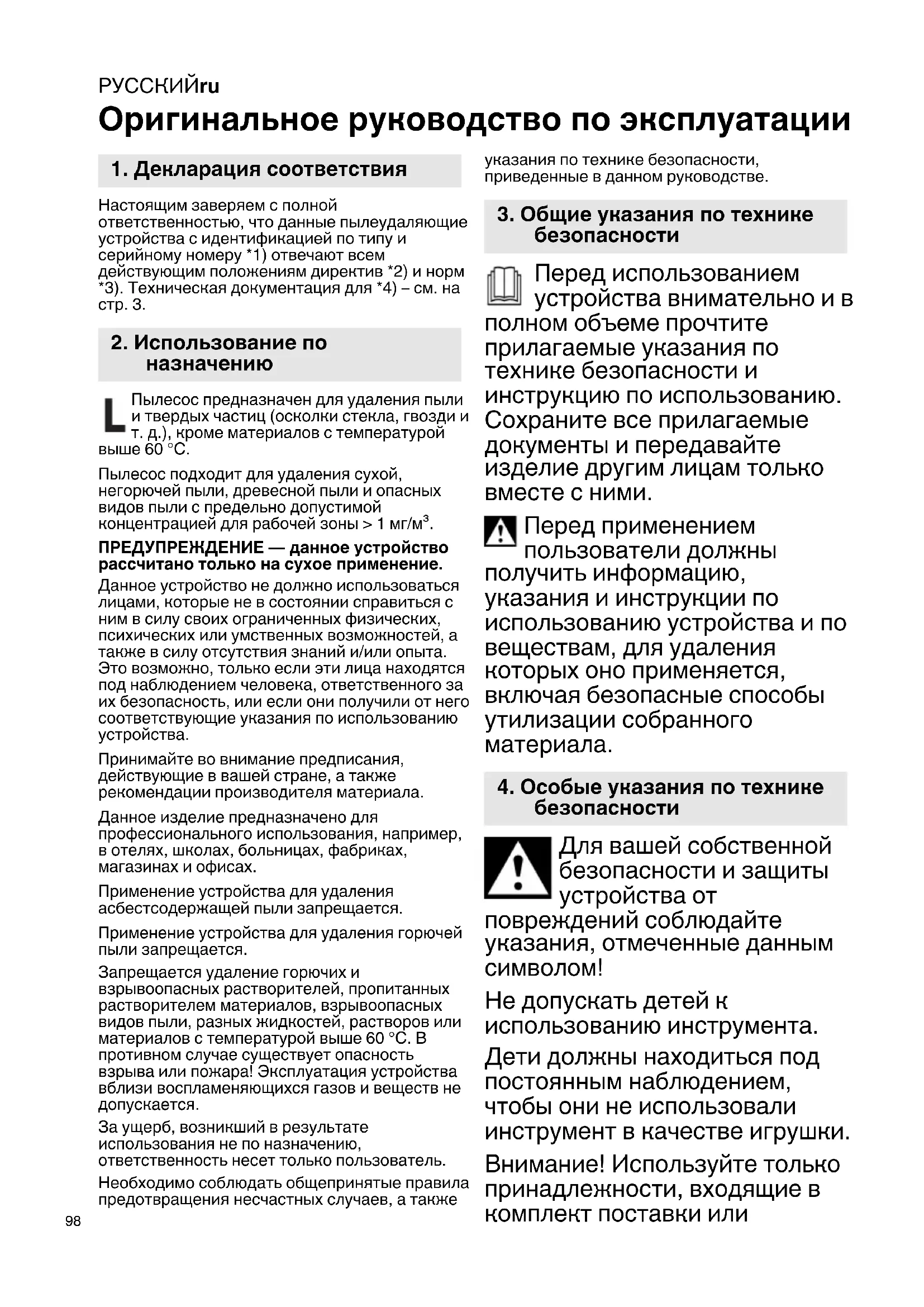 Оригинальное руководство по эксплуатации Настоящим заверяем с полной ответственностью, что данные пылеудаляющие устройства с идентификацией по типу и серийному номеру *1) отвечают всем действующим положениям директив *2) и норм *3). Техническая документация для *4) – см. на стр. 3. Пылесос предназначен для удаления пыли и твердых частиц (осколки стекла, гвозди и т. д.), кроме материалов с температурой выше 60 °C. Пылесос подходит для удаления сухой, негорючей пыли, древесной пыли и опасных видов пыли с предельно допустимой концентрацией для рабочей зоны > 1 мг/м³. ПРЕДУПРЕЖДЕНИЕ — данное устройство рассчитано только на сухое применение. Данное устройство не должно использоваться лицами, которые не в состоянии справиться с ним в силу своих ограниченных физических, психических или умственных возможностей, а также в силу отсутствия знаний и/или опыта. Это возможно, только если эти лица находятся под наблюдением человека, ответственного за их безопасность, или если они получили от него соответствующие указания по использованию устройства. Принимайте во внимание предписания, действующие в вашей стране, а также рекомендации производителя материала. Данное изделие предназначено для профессионального использования, например, в отелях, школах, больницах, фабриках, магазинах и офисах. Применение устройства для удаления асбестсодержащей пыли запрещается. Применение устройства для удаления горючей пыли запрещается. Запрещается удаление горючих и взрывоопасных растворителей, пропитанных растворителем материалов, взрывоопасных видов пыли, разных жидкостей, растворов или материалов с температурой выше 60 °C. В противном случае существует опасность взрыва или пожара! Эксплуатация устройства вблизи воспламеняющихся газов и веществ не допускается. За ущерб, возникший в результате использования не по назначению, ответственность несет только пользователь. Необходимо соблюдать общепринятые правила предотвращения несчастных случаев, а также указания по технике безопасности, приведенные в данном руководстве. Перед использованием устройства внимательно и в полном объеме прочтите прилагаемые указания по технике безопасности и инструкцию по использованию. Сохраните все прилагаемые документы и передавайте изделие другим лицам только вместе с ними. Перед применением пользователи должны получить информацию, указания и инструкции по использованию устройства и по веществам, для удаления которых оно применяется, включая безопасные способы утилизации собранного