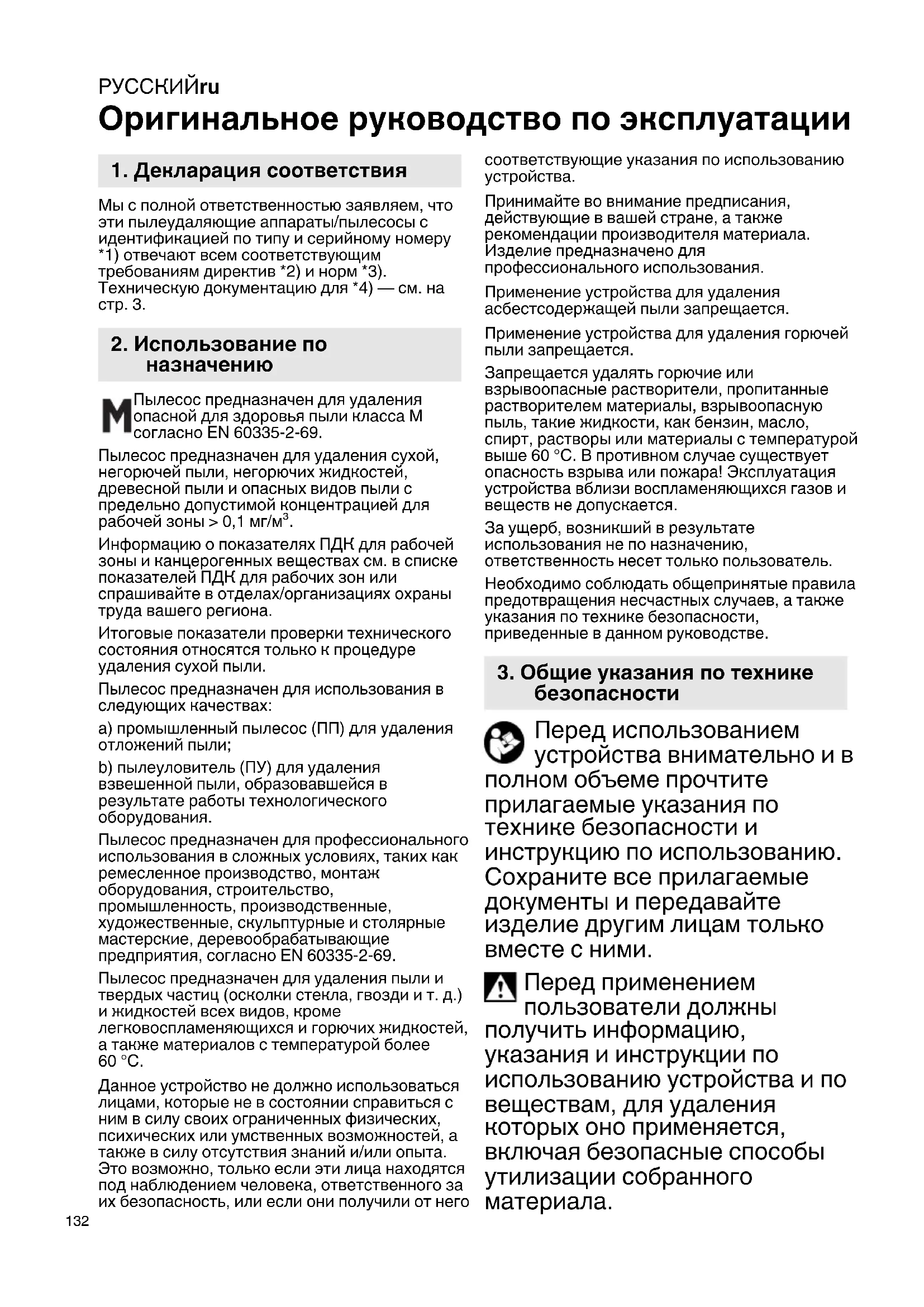 Оригинальное руководство по эксплуатации Мы с полной ответственностью заявляем, что эти пылеудаляющие аппараты/пылесосы с идентификацией по типу и серийному номеру *1) отвечают всем соответствующим требованиям директив *2) и норм *3). Техническую документацию для *4) — см. на стр. 3. Пылесос предназначен для удаления опасной для здоровья пыли класса M согласно EN 60335-2-69. Пылесос предназначен для удаления сухой, негорючей пыли, негорючих жидкостей, древесной пыли и опасных видов пыли с предельно допустимой концентрацией для рабочей зоны > 0,1 мг/м³. Информацию о показателях ПДК для рабочей зоны и канцерогенных веществах см. в списке показателей ПДК для рабочих зон или спрашивайте в отделах/организациях охраны труда вашего региона. Итоговые показатели проверки технического состояния относятся только к процедуре удаления сухой пыли. Пылесос предназначен для использования в следующих качествах: a) промышленный пылесос (ПП) для удаления отложений пыли; b) пылеуловитель (ПУ) для удаления взвешенной пыли, образовавшейся в результате работы технологического оборудования. Пылесос предназначен для профессионального использования в сложных условиях, таких как ремесленное производство, монтаж оборудования, строительство, промышленность, производственные, художественные, скульптурные и столярные мастерские, деревообрабатывающие предприятия, согласно EN 60335-2-69. Пылесос предназначен для удаления пыли и твердых частиц (осколки стекла, гвозди и т. д.) и жидкостей всех видов, кроме легковоспламеняющихся и горючих жидкостей, а также материалов с температурой более 60 °C. Данное устройство не должно использоваться лицами, которые не в состоянии справиться с ним в силу своих ограниченных физических, психических или умственных возможностей, а также в силу отсутствия знаний и/или опыта. Это возможно, только если эти лица находятся под наблюдением человека, ответственного за их безопасность, или если они получили от него соответствующие указания по использованию устройства. Принимайте во внимание предписания, действующие в вашей стране, а также рекомендации производителя материала. Изделие предназначено для профессионального использования. Применение устройства для удаления асбестсодержащей пыли запрещается. Применение устройства для удаления горючей пыли запрещается. Запрещается удалять горючие или взрывоопасные растворители, пропитанные растворителем материалы, взрывоопасную пыль, такие жидкости, как бензин, масло, спирт, растворы или материалы с температурой выше 60 °C. В противном случае существует опасность взрыва или пожара! Эксплуатация устройства вблизи воспламеняющихся газов и веществ не допускается. За ущерб, возникший в результате использования не по назначению, ответственность несет только пользователь. Необходимо соблюдать общепринятые правила предотвращения несчастных случаев, а также указания по технике безопасности, приведенные в данном руководстве. Перед использованием устройства внимательно и в полном объеме прочтите прилагаемые указания по технике безопасности и инструкцию по использованию. Сохраните все прилагаемые документы и передавайте изделие другим лицам только вместе с ними. Перед применением пользователи должны получить информацию, указания и инструкции по использованию устройства и по веществам, 