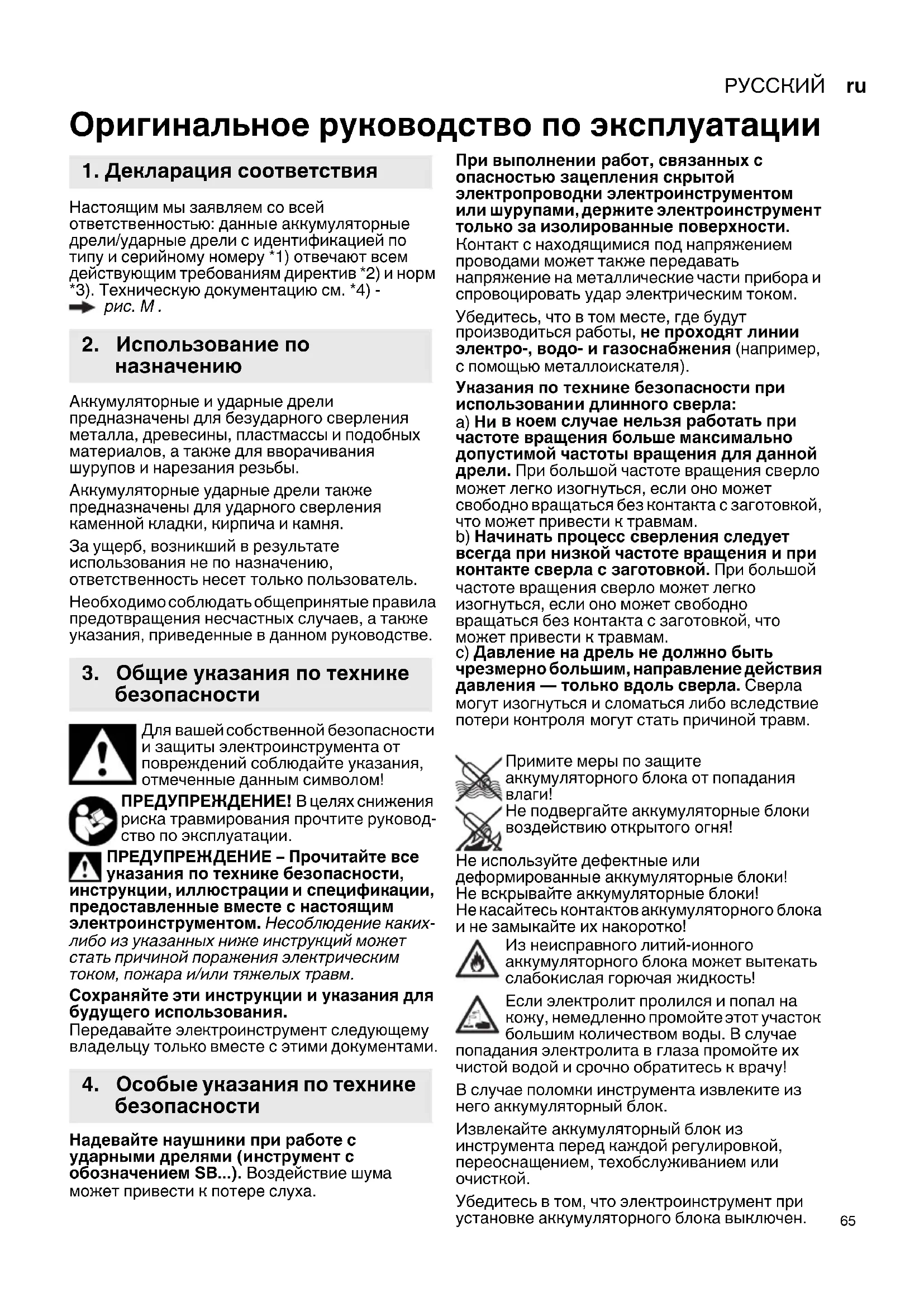 отмеченные данным символом! ПРЕДУПРЕЖДЕНИЕ! В целях снижения риска травмирования прочтите руковод- ство по эксплуатации. ПРЕДУПРЕЖДЕНИЕ – Прочитайте все указания по технике безопасности, инструкции, иллюстрации и спецификации, предоставленные вместе с настоящим электроинструментом. Несоблюдение каких- либо из указанных ниже инструкций может стать причиной поражения электрическим током, пожара и/или тяжелых травм. Сохраняйте эти инструкции и указания для будущего использования. Передавайте электроинструмент следующему владельцу только вместе с этими документами. Надевайте наушники при работе с ударными дрелями (инструмент с обозначением SB...). Воздействие шума может привести к потере слуха. При выполнении работ, связанных с опасностью зацепления скрытой электропроводки электроинструментом или шурупами, держите электроинструмент