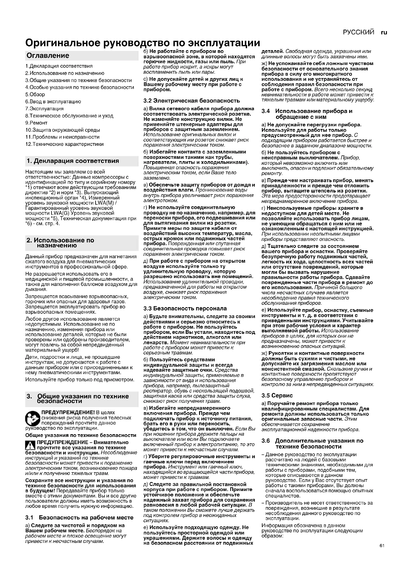Оригинальное руководство по эксплуатации 1.Декларация соответствия 2.Использование по назначению 3.Общие указания по технике безопасности 4.Особые указания по технике безопасности 5.Обзор 6.Ввод в эксплуатацию 7.Эксплуатация 8.Техническое обслуживание и уход 9.Ремонт 10.Защита окружающей среды 11.Проблемы и неисправности 12.Технические характеристики Настоящим мы заявляем со всей ответственностью: Данные компрессоры с идентификацией по типу и серийному номеру *1) отвечают всем действующим требованиям директив *2) и норм *3). Выпускающий инспекционный орган *4), Измеренный уровень звуковой мощности LWA(M) / Гарантированный уровень звуковой мощности LWA(G) Уровень звуковой мощности *5), Техническая документация при *6) - см. стр. 4. Данный прибор предназначен для нагнетания сжатого воздуха для пневматических инструментов в профессиональной сфере. Не разрешается использовать его в медицинской и пищевой промышленности, а также для наполнения баллонов воздухом для