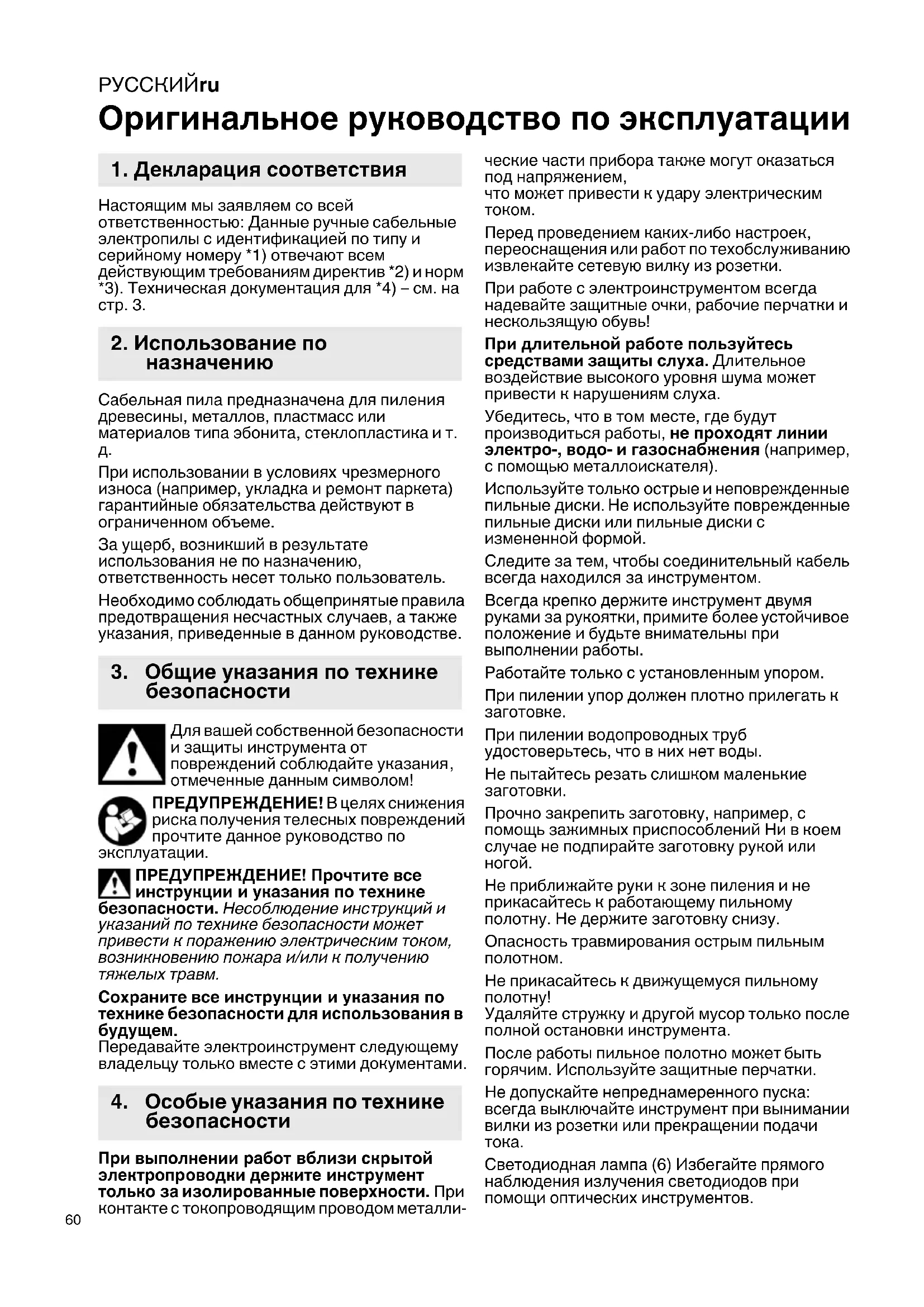 Оригинальное руководство по эксплуатации Настоящим мы заявляем со всей ответственностью: Данные ручные сабельные электропилы с идентификацией по типу и серийному номеру *1) отвечают всем действующим требованиям директив *2) и норм *3). Техническая документация для *4) – см. на стр. 3. Сабельная пила предназначена для пиления древесины, металлов, пластмасс или материалов типа эбонита, стеклопластика и т.