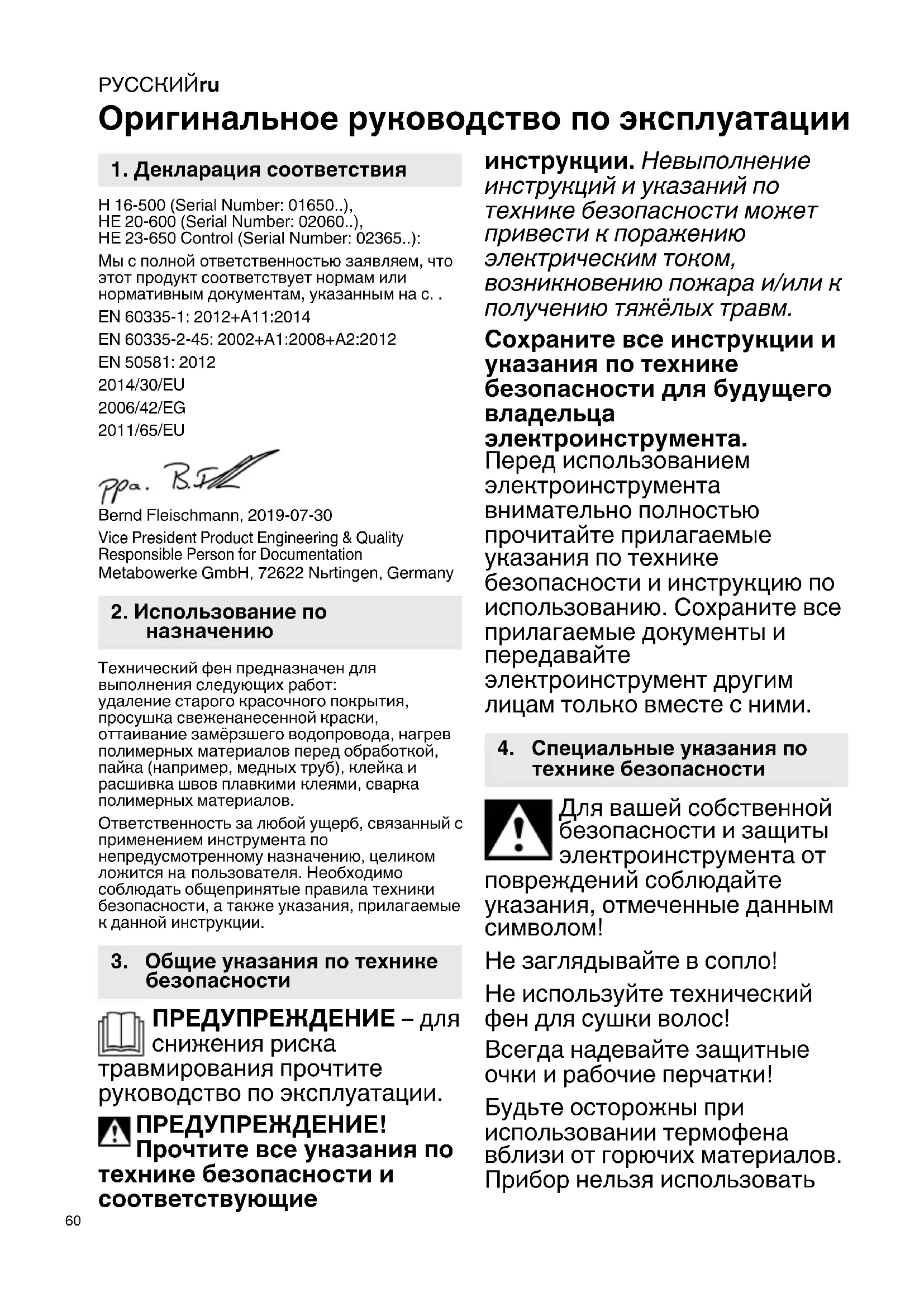 Оригинальное руководство по эксплуатации H 16-500 (Serial Number: 01650..), HE 20-600 (Serial Number: 02060..), HE 23-650 Control (Serial Number: 02365..): Мы с полной ответственностью заявляем, что этот продукт соответствует нормам или нормативным документам, указанным на с. . EN 60335-1: 2012+A11:2014 EN 60335-2-45: 2002+A1:2008+A2:2012 EN 50581: 2012 2014/30/EU 2006/42/EG 2011/65/EU Bernd Fleischmann, 2019-07-30 Vice President Product Engineering & Quality Responsible Person for Documentation Metabowerke GmbH, 72622 Nьrtingen, Germany Технический фен предназначен для выполнения следующих работ: удаление старого красочного покрытия, просушка свеженанесенной краски, оттаивание замёрзшего водопровода, нагрев полимерных материалов перед обработкой, пайка (например, медных труб), клейка и расшивка швов плавкими клеями, сварка полимерных материалов. Ответственность за любой ущерб, связанный с применением инструмента по непредусмотренному назначению, целиком