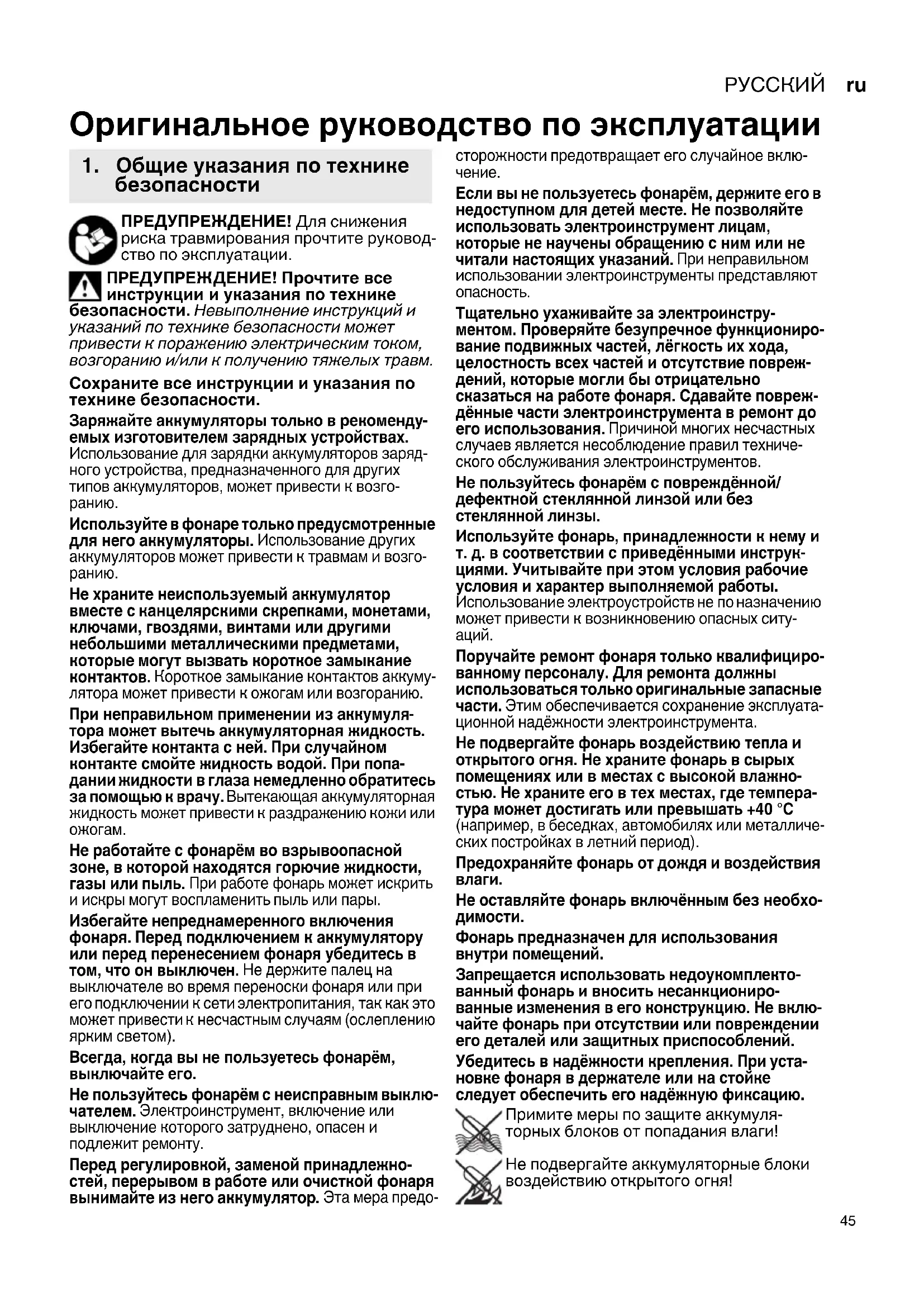 Электроинструмент, включение или выключение которого затруднено, опасен и подлежит ремонту. Перед регулировкой, заменой принадлежно- стей, перерывом в работе или очисткой фонаря вынимайте из него аккумулятор. Эта мера предо- сторожности предотвращает его случайное вклю-