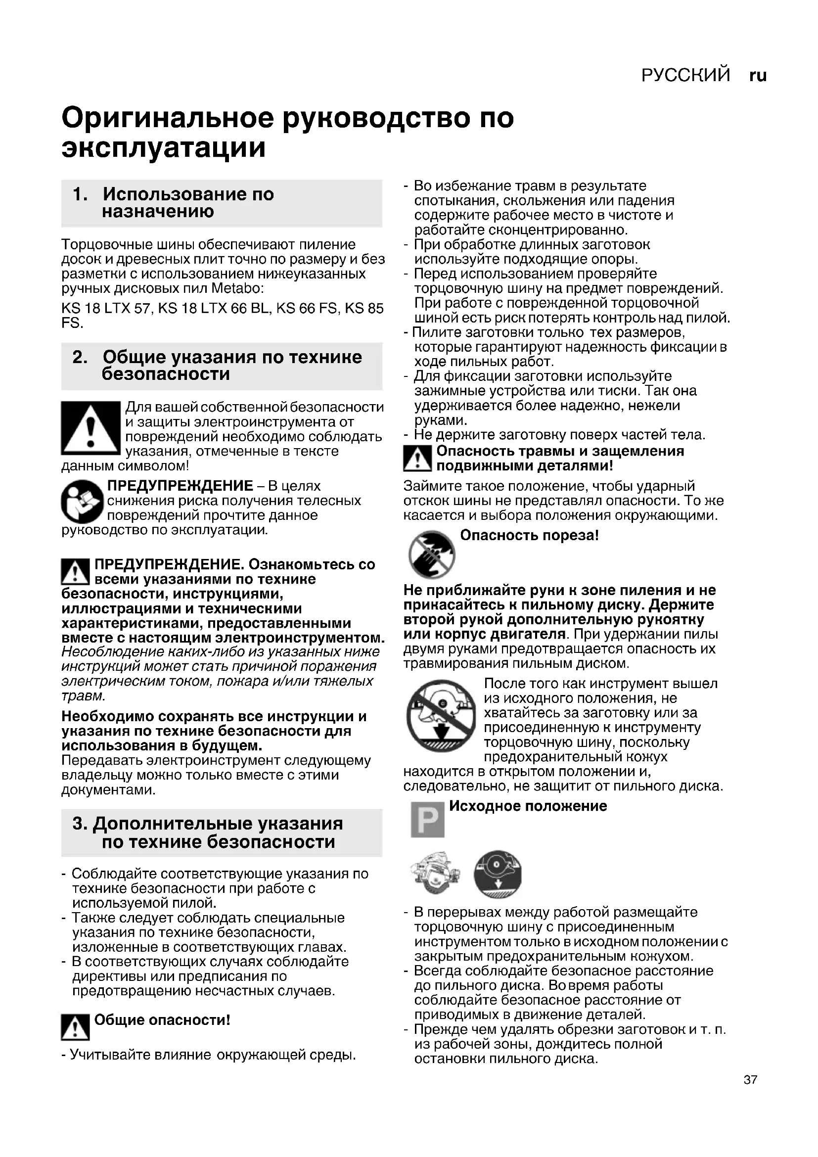 Торцовочные шины обеспечивают пиление досок и древесных плит точно по размеру и без разметки с использованием нижеуказанных ручных дисковых пил Metabo: KS 18 LTX 57, KS 18 LTX 66 BL, KS 66 FS, KS 85 FS. Для вашей собственной безопасности и защиты электроинструмента от повреждений необходимо соблюдать указания, отмеченные в тексте данным символом! ПРЕДУПРЕЖДЕНИЕ – В целях снижения риска получения телесных повреждений прочтите данное руководство по эксплуатации