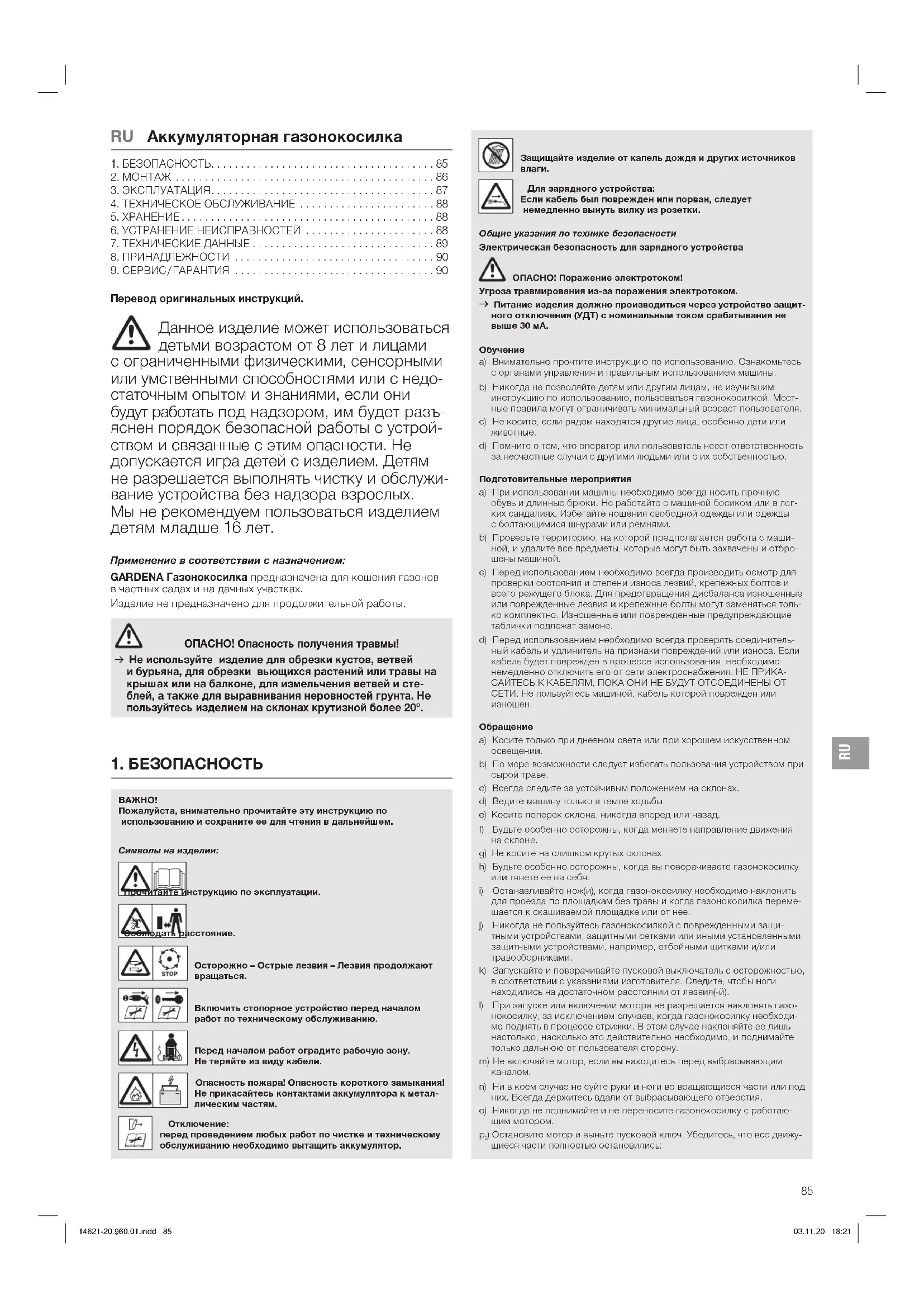 Перевод оригинальных инструкций. Данное изделие может использоваться детьми возрастом от 8 лет и лицами сограниченными физическими, сенсорными или умственными способностями или с недо- статочным опытом и знаниями, если они будут работать под надзором, им будет разъ- яснен порядок безопасной работы с устрой- ством и связанные с этим опасности. Не допускается игра детей с изделием. Детям не разрешается выполнять чистку и обслужи- вание устройства без надзора взрослых. Мы не рекомендуем пользоваться изделием детям младше 16 лет. Применение в соответствии с назначением: GARDENA Газонокосилка предназначена для кошения газонов в частных садах и на дачных участках. Изделие не предназначено для продолжительной работы. ОПАСНО! Опасность получения травмы! v Не используйте изделие для обрезки кустов, ветвей ибурьяна, для обрезки вьющихся растений или травы на крышах или на балконе, для измельчения ветвей и сте- блей,а также для выравнивания неровностей грунта. Не пользуйтесь изделием на склонах крутизной более 20°. Защищайте изделие от капель дождя и других источников
