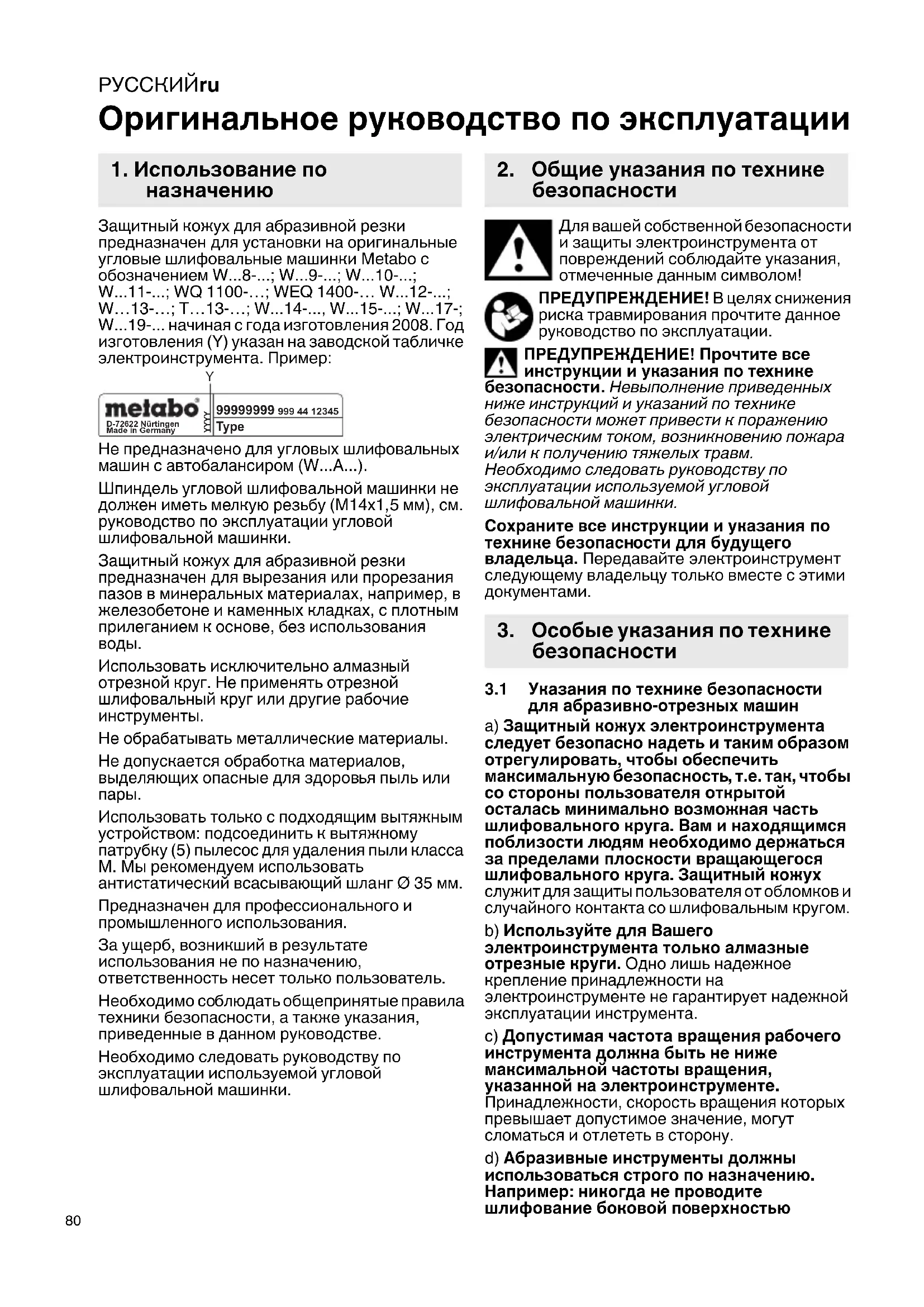 - Оригинальное руководство по эксплуатации Защитный кожух для абразивной резки предназначен для установки на оригинальные угловые шлифовальные машинки Metabo с обозначением W - p. 8