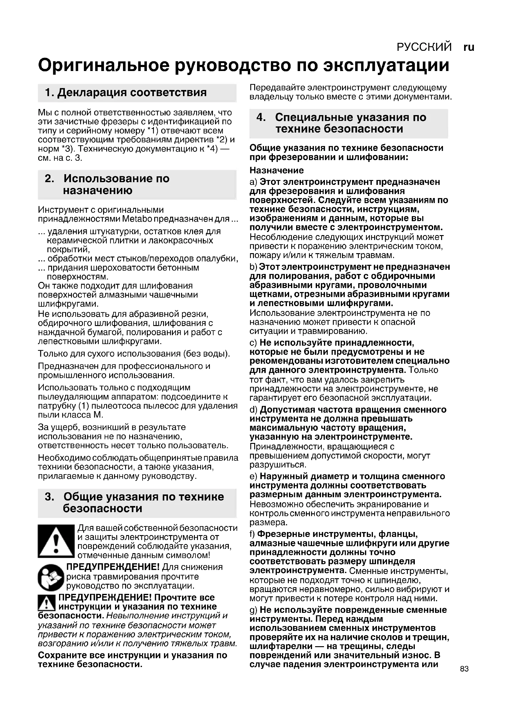 Оригинальное руководство по эксплуатации Мы с полной ответственностью заявляем, что эти зачистные фрезеры с идентификацией по типу и серийному номеру *1) отвечают всем соответствующим требованиям директив *2) и норм *3). Техническую документацию к *4) — см. на с. 3. Инструмент с оригинальными принадлежностями Metabo предназначен для ... ... удаления штукатурки, остатков клея для керамической плитки и лакокрасочных