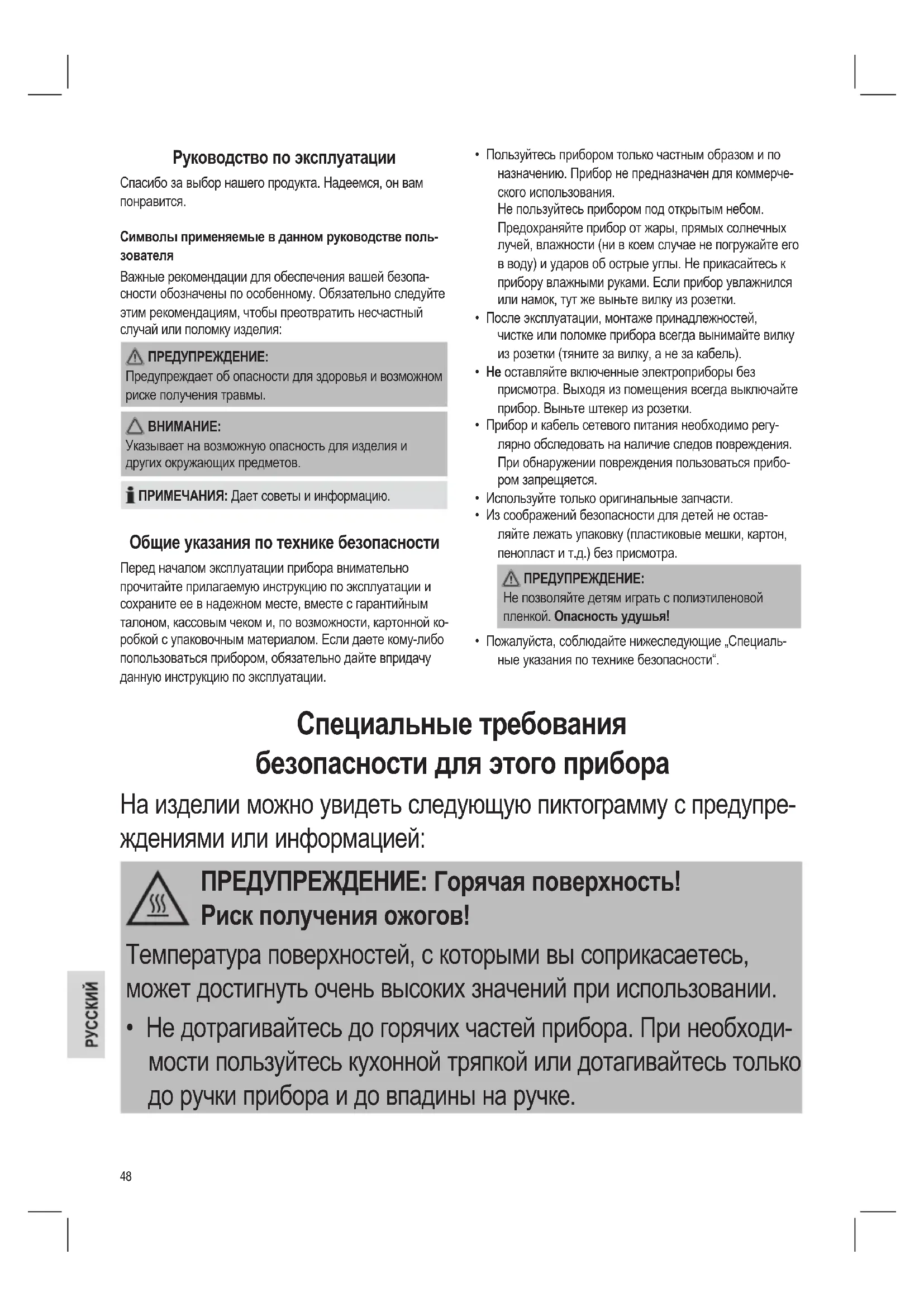 - Пожалуйста, соблюдайте нижеследующие „Специаль- ные указания по технике безопасности“. Специальные требования безопасности для этого прибора Нa издeлии можнo yвидeть cлeдyющyю пиктoгpaммy c пpeдyпpe- ждeниями или инфopмaциeй: ПРЕДУПРЕЖДЕНИЕ: Горячая поверхность! Риск получения ожогов! Температура поверхностей, с которыми вы соприкасаетесь, может достигнуть очень высоких значений при использовании.