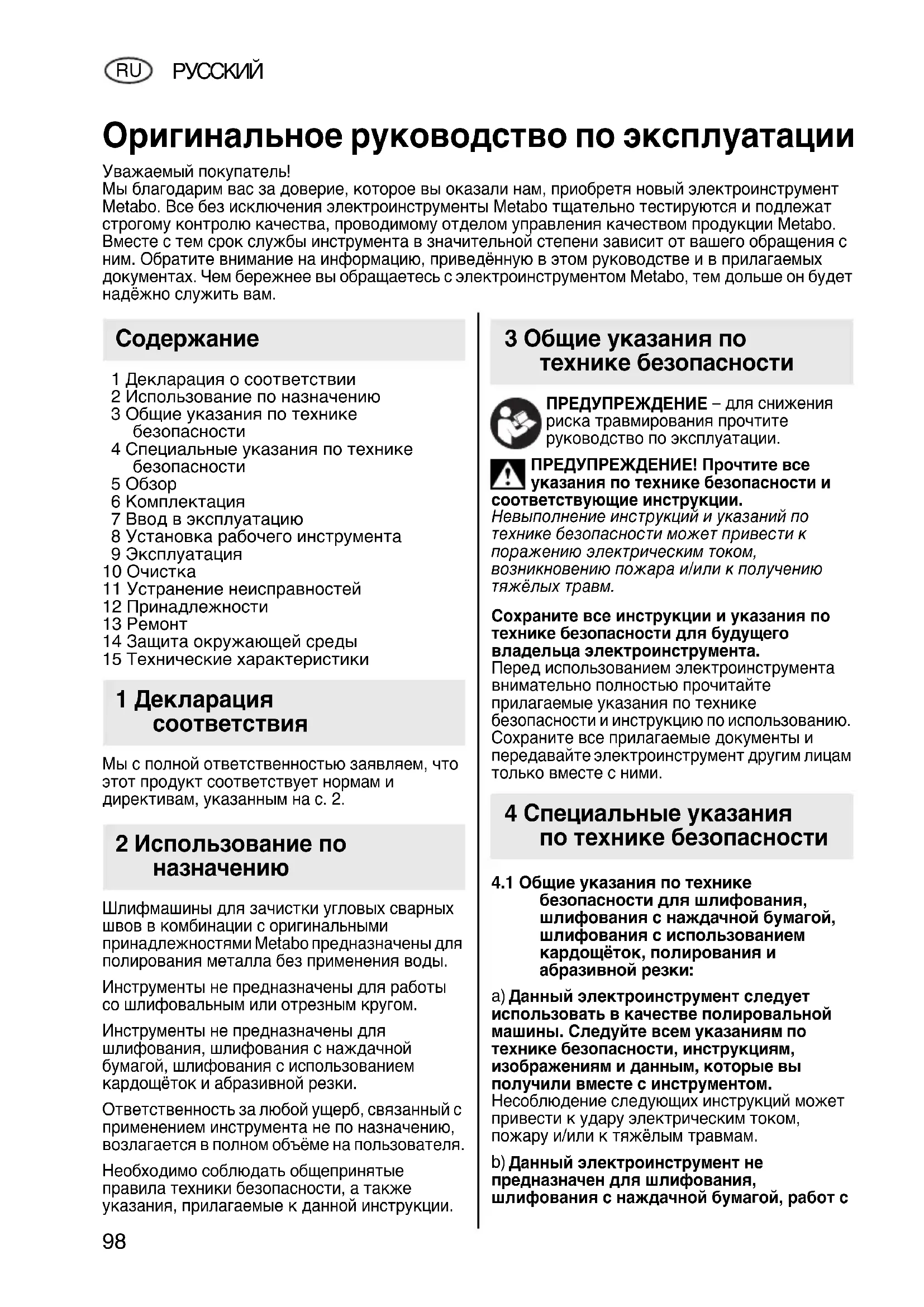 1 Декларация о соответствии 2 Использование по назначению 3 Общие указания по технике безопасности 4 Специальные указания по технике безопасности 5 Обзор 6 Комплектация 7 Ввод в эксплуатацию 8 Установка рабочего инструмента 9 Эксплуатация 10 Очистка 11 Устранение неисправностей 12 Принадлежности 13 Ремонт 14 Защита окружающей среды 15 Технические характеристики Мы с полной ответственностью заявляем, что этот продукт соответствует нормам и директивам, указанным на с. 2. Шлифмашины для зачистки угловых сварных швов в комбинации с оригинальными принадлежностями Metabo предназначены для полирования металла без применения воды. Инструменты не предназначены для работы со шлифовальным или отрезным кругом. Инструменты не предназначены для шлифования, шлифования с наждачной бумагой, шлифования с использованием кардощёток и абразивной резки. Ответственность за любой ущерб, связанный с применением инструмента не по назначению, возлагается в полном объёме на пользователя. Необходимо соблюдать общепринятые правила техники безопасности, а также указания, прилагаемые к данной инструкции. ПРЕДУПРЕЖДЕНИЕ – для снижения риска травмирования прочтите руководство по эксплуатации. ПРЕДУПРЕЖДЕНИЕ! Прочтите все указания по технике безопасности и соответствующие инструкции. Невыполнение инструкций и указаний по технике безопасности может привести к поражению электрическим током, возникновению пожара и/или к получению тяжёлых травм. Сохраните все инструкции и указания по технике безопасности для будущего владельца электроинструмента. Перед использованием электроинструмента внимательно полностью прочитайте прилагаемые указания по технике безопасности и инструкцию по использованию. Сохраните все прилагаемые документы и передавайте электроинструмент другим лицам только вместе с ними.