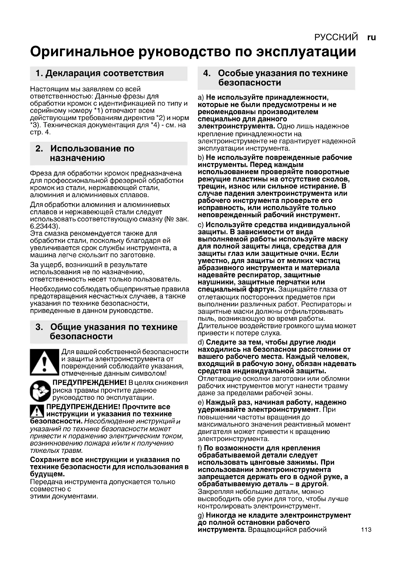 Оригинальное руководство по эксплуатации Настоящим мы заявляем со всей ответственностью: Данные фрезы для обработки кромок с идентификацией по типу и серийному номеру *1) отвечают всем действующим требованиям директив *2) и норм *3). Техническая документация для *4) - см. на стр. 4. Фреза для обработки кромок предназначена для профессиональной фрезерной обработки кромок из стали, нержавеющей стали, алюминия и алюминиевых сплавов.
