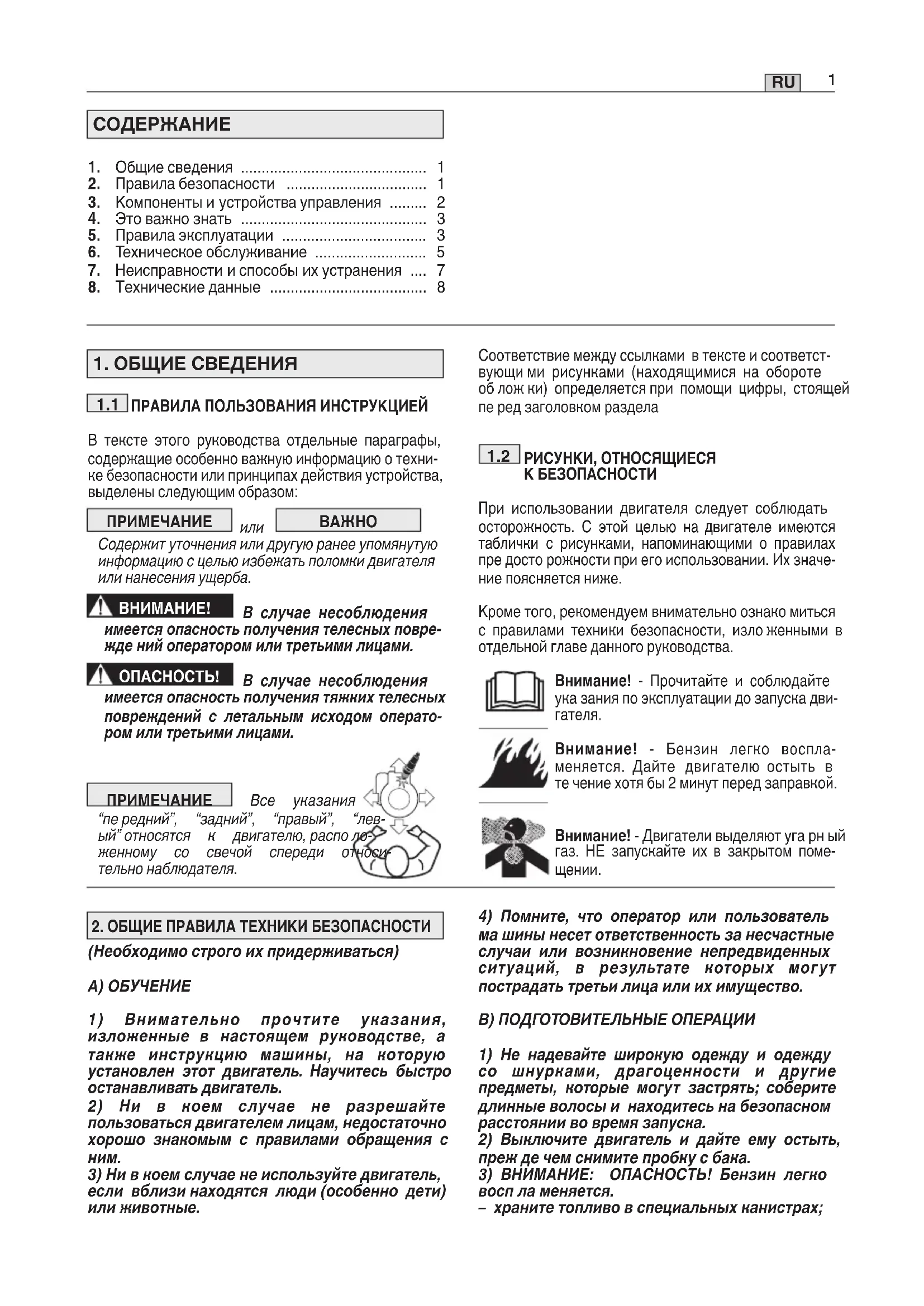РИСУНKИ, ОТНОСЯЩИЕСЯ K БЕЗОПАСНОСТИ При использовании двигателя следует соблюдать осто рожность. С этой целью на двигателе имеются та блички с рисунками, напоминающими о правилах пре досто рожности при его использовании. Их значе- ние поясняется ниже. Kроме того, рекомендуем внимательно ознако миться с правилами техники безопасности, изло женными в отдельной главе данного руководства. Внимание! - Прочитайте и соблюдайте ука зания по эксплуатации до запуска дви-