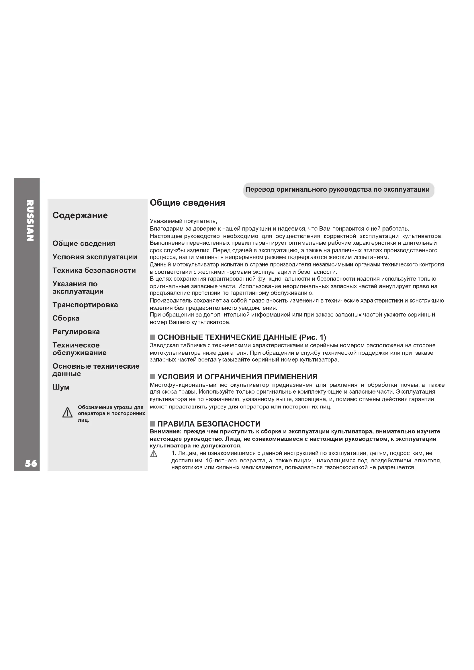 Общие сведения Уважаемый покупатель, Благодарим за доверие к нашей продукции и надеемся, что Вам понравится с ней работать. Настоящее руководство необходимо для осуществления корректной эксплуатации культиватора. Выполнение перечисленных правил гарантирует оптимальные рабочие характеристики и длительный срок службы изделия. Перед сдачей в эксплуатацию, а также на различных этапах производственного процесса, наши машины в непрерывном режиме подвергаются жестким испытаниям. Данный мотокультиватор испытан в стране производителя независимыми органами технического контроля в соответствии с жесткими нормами эксплуатации и безопасности. В целях сохранения гарантированной функциональности и безопасности изделия используйте только оригинальные запасные части. Использование неоригинальных запасных частей аннулирует право на предъявление претензий по гарантийному обслуживанию. Производитель сохраняет за собой право вносить изменения в технические характеристики и конструкцию изделия без предварительного уведомления. При обращении за дополнительной информацией или при заказе запасных частей укажите серийный номер Вашего культиватора. n ОСНОВНЫЕ ТЕХНИЧЕСКИЕ ДАННЫЕ (Рис. 1) Заводская табличка с техническими характеристиками и серийным номером расположена на стороне мотокультиватора ниже двигателя. При обращении в службу технической поддержки или при заказе запасных частей всегда указывайте серийный номер культиватора. n УСЛОВИЯ И ОГРАНИЧЕНИЯ ПРИМЕНЕНИЯ Многофункциональный мотокультиватор предназначен для рыхления и обработки почвы, а также для скоса травы. Используйте только оригинальные комплектующие и запасные части. Эксплуатация культиватора не по назначению, указанному выше, запрещена, и, помимо отмены действия гарантии, может представлять угрозу для оператора или посторонних лиц. n ПРАВИЛА БЕЗОПАСНОСТИ Внимание: прежде чем приступить к сборке и эксплуатации культиватора, внимательно изучите настоящее руководство. Лица, не ознакомившиеся с настоящим руководством, к эксплуатации культиватора не допускаются.