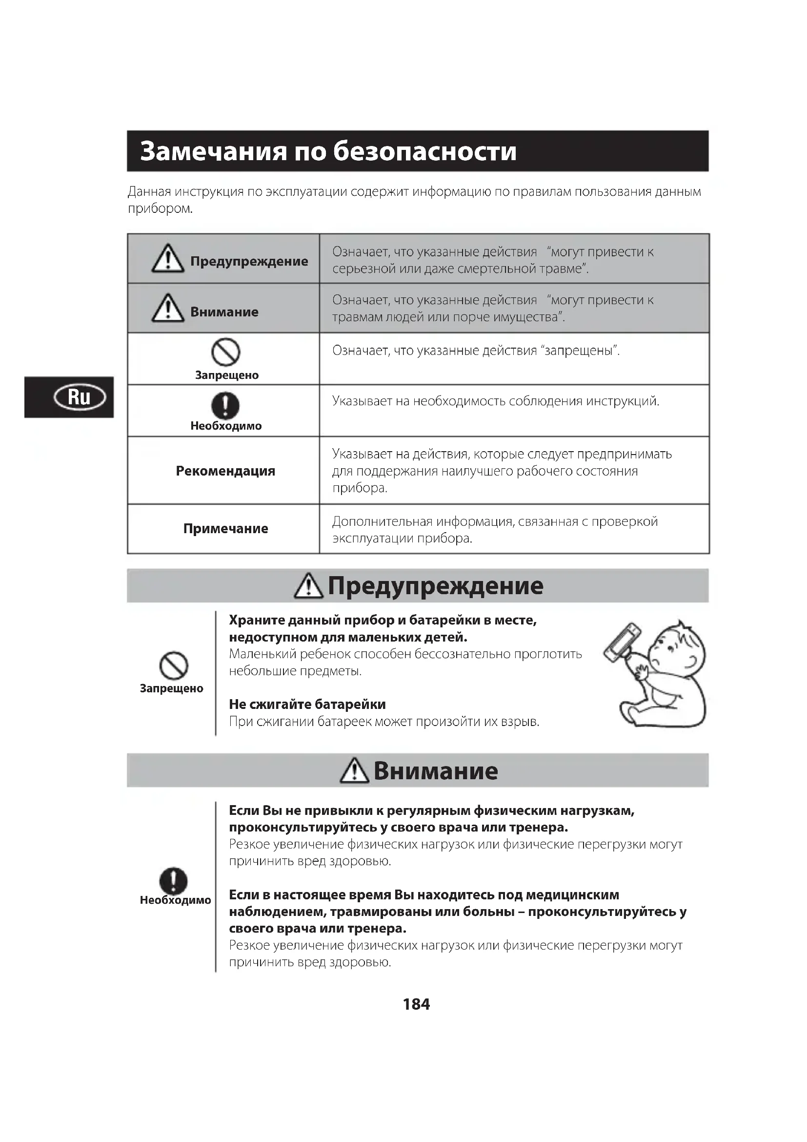 Храните данный прибор и батарейки в месте, недоступном для маленьких детей. Маленький ребенок способен бессознательно проглотить небольшие предметы. Не сжигайте батарейки При сжигании батареек может произойти их взрыв. Если Вы не привыкли к регулярным физическим нагрузкам, проконсультируйтесь у своего врача или тренера. Резкое увеличение физических нагрузок или физические перегрузки могут причинить вред здоровью. Если в настоящее время Вы находитесь под медицинским наблюдением, травмированы или больны – проконсультируйтесь у своего врача или тренера. Резкое увеличение физических нагрузок или физические перегрузки могут причинить вред здоровью.185