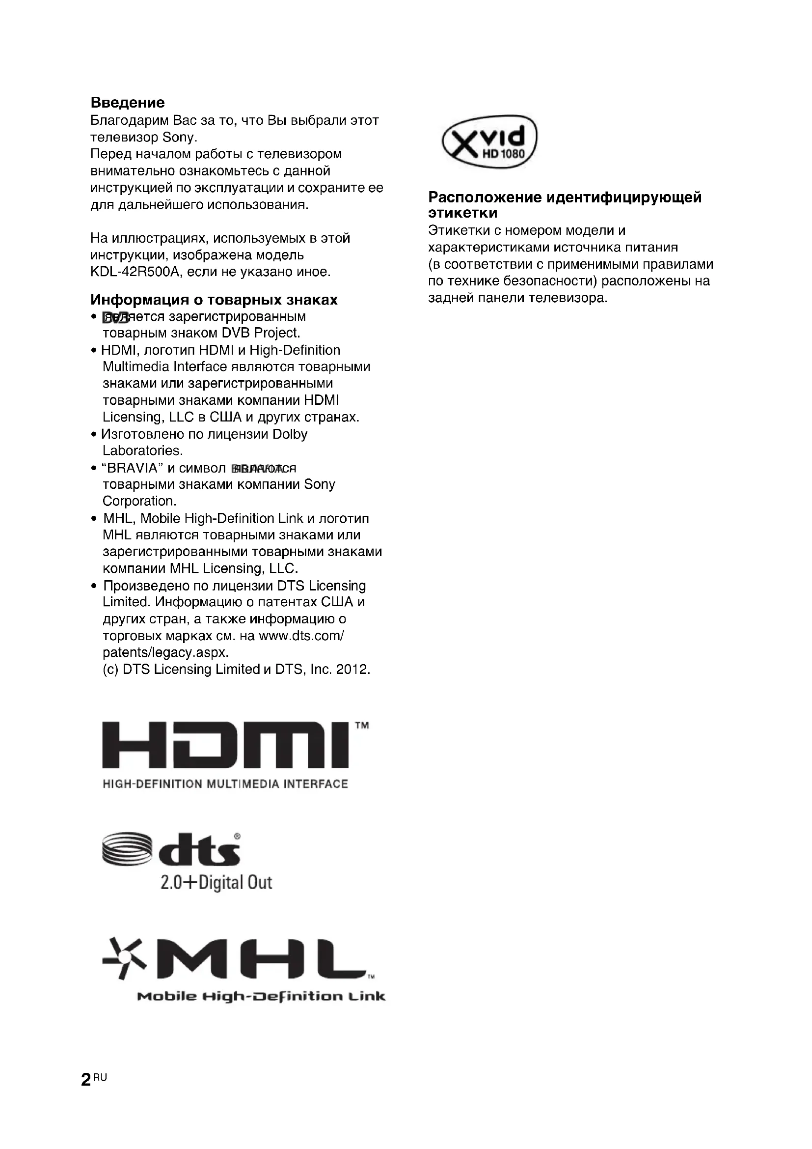 Благодарим Вас за то, что Вы выбрали этот телевизор Sony. Перед началом работы с телевизором внимательно ознакомьтесь с данной инструкцией по эксплуатации и сохраните ее для дальнейшего использования. На иллюстрациях, используемых в этой инструкции, изображена модель KDL-42R500A, если не указано иное. Информация о товарных знаках