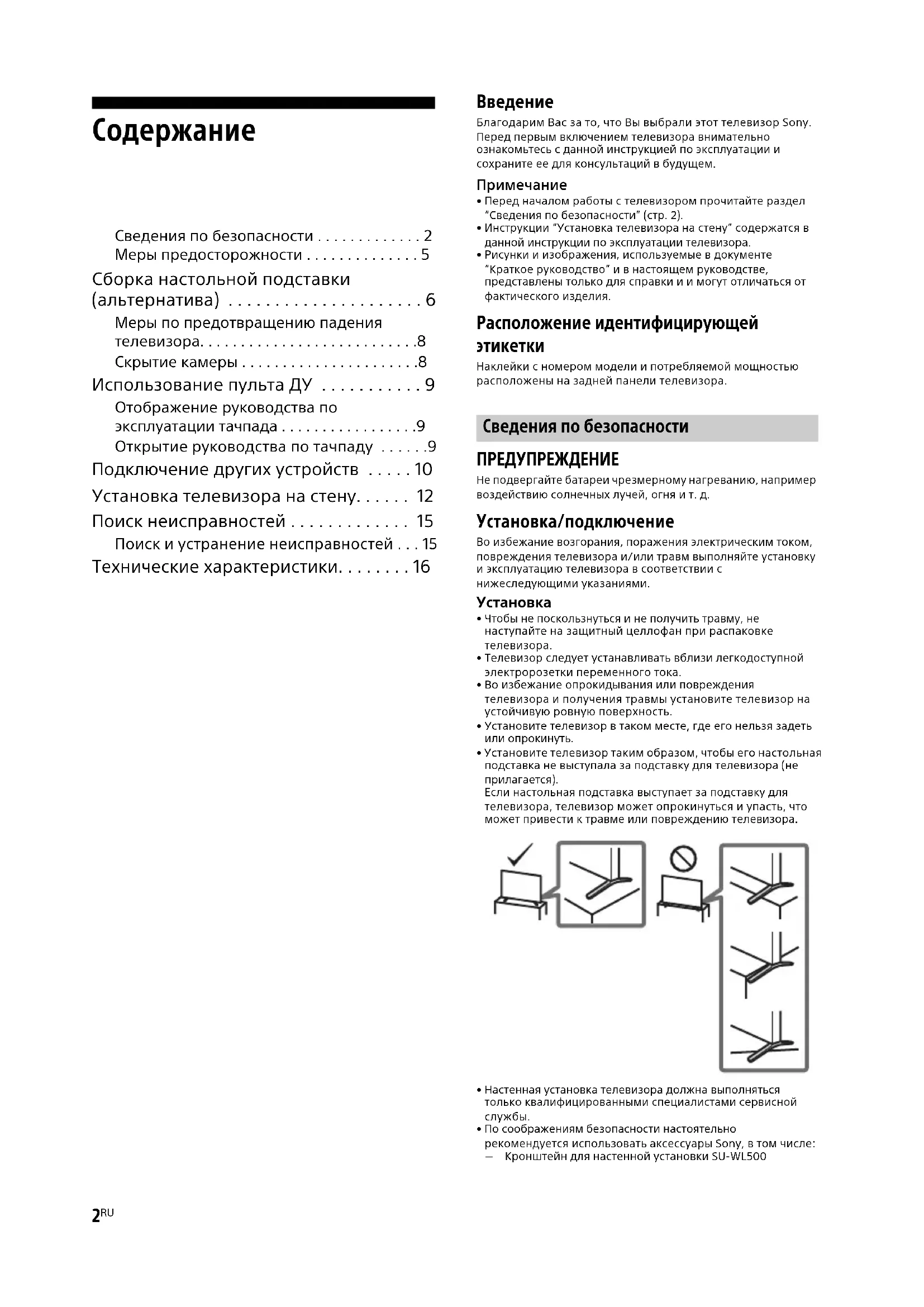 - Чтобы не поскользнуться и не получить травму, не наступайте на защитный целлофан при распаковке телевизора.• Телевизор следует устанавливать вблизи легкодоступной электророзетки переменного тока.• Во избежание опрокидывания или повреждения телевизора и получения травмы установите телевизор на устойчивую ровную поверхность.• Установите телевизор в таком месте, где его нельзя задеть или опрокинуть.• Установите телевизор таким образом, чтобы его настольная подставка не выступала за подставку для телевизора (не прилагается).Если настольная подставка выступает за подставку для телевизора, телевизор может опрокинуться и упасть, что может привести к травме или повреждению телевизора.• Настенная установка телевизора должна выполняться только квалифицированными специалистами сервисной службы.• По соображениям безопасности настоятельно рекомендуется использовать аксессуары Sony, в том числе: Кронштейн для настенной установки SU-WL500 Сведения по безопасности3