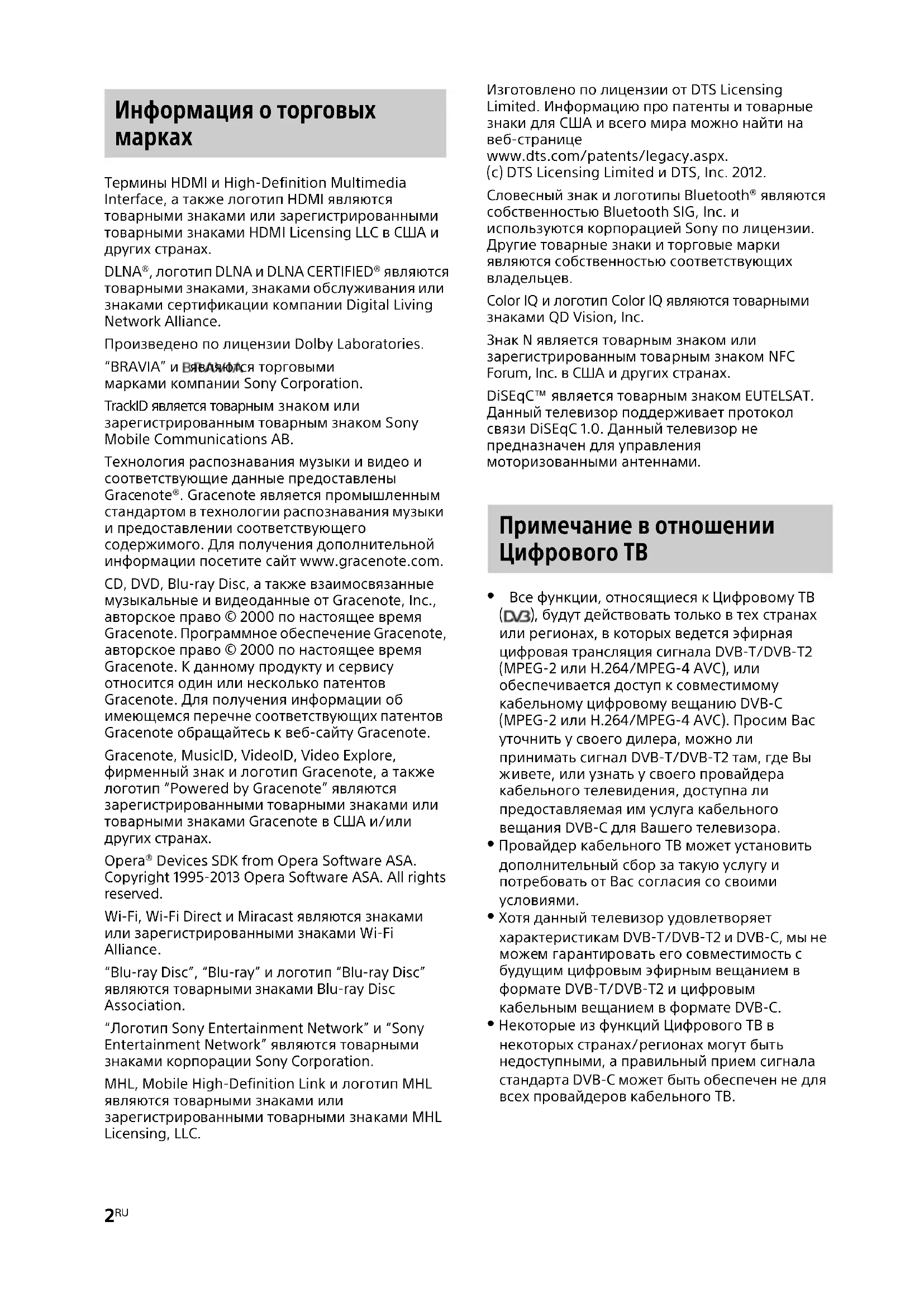 Термины HDMI и High-Definition Multimedia Interface, а также логотип HDMI являются товарными знаками или зарегистрированными товарными знаками HDMI Licensing LLC в США и других странах. DLNA®, логотип DLNA и DLNA CERTIFIED® являются товарными знаками, знаками обслуживания или знаками сертификации компании Digital Living Network Alliance. Произведено по лицензии Dolby Laboratories. “BRAVIA” и являются торговыми марками компании Sony Corporation. TrackID является товарным знаком или зарегистрированным товарным знаком Sony Mobile Communications AB. Технология распознавания музыки и видео и соответствующие данные предоставлены Gracenote®. Gracenote является промышленным стандартом в технологии распознавания музыки и предоставлении соответствующего содержимого. Для получения дополнительной информации посетите сайт www.gracenote.com. CD, DVD, Blu-ray Disc, а также взаимосвязанные музыкальные и видеоданные от Gracenote, Inc., авторское право © 2000 по настоящее время Gracenote. Программное обеспечение Gracenote, авторское право © 2000 по настоящее время Gracenote. К данному продукту и сервису относится один или несколько патентов Gracenote. Для получения информации об имеющемся перечне соответствующих патентов Gracenote обращайтесь к веб-сайту Gracenote. Gracenote, MusicID, VideoID, Video Explore, фирменный знак и логотип Gracenote, а также логотип “Powered by Gracenote” являются зарегистрированными товарными знаками или товарными знаками Gracenote в США и/или других странах. Opera® Devices SDK from Opera Software ASA. Copyright 1995-2013 Opera Software ASA. All rights reserved. Wi-Fi, Wi-Fi Direct и Miracast являются знаками или зарегистрированными знаками Wi-Fi Alliance. “Blu-ray Disc”, “Blu-ray” и логотип “Blu-ray Disc” являются товарн