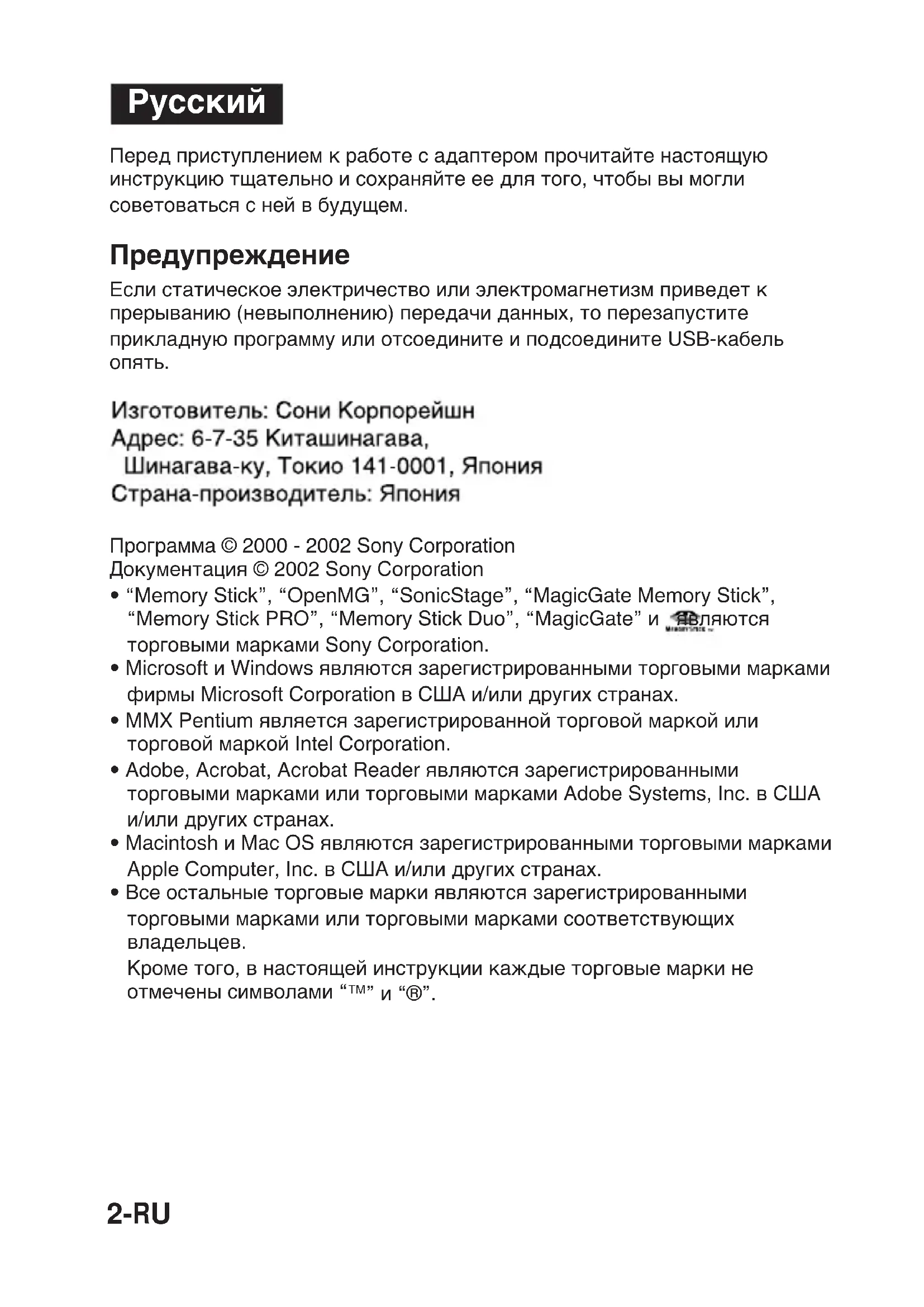 × 22,5 × 85,5 mm (мм) (Ш × В × Г) Ориентировочная масса 40 g (г) (не включая “Memory Stick”) Условия окружающей среды Температура – от 0 до 40°С (Не допускается конденсация) Отн.влажность – от 20 до 80% (Не допускается конденсация) В конструкцию и техническую характеристику могут быть внесены некоторые изменения без дополнительной информации. В случае, если у вас есть какие-нибудь вопросы/замечания, связанные с настоящим изделием, посетите наш Customer Support на web-сайте по адресу http://www.sony.net/memorystick/supporte В случае, если у вас есть какие-нибудь вопросы/замечания, связанные с технологией “OpenMG”, посетите web-сайт по адресу http://www.openmg.com/15-RU2-CT