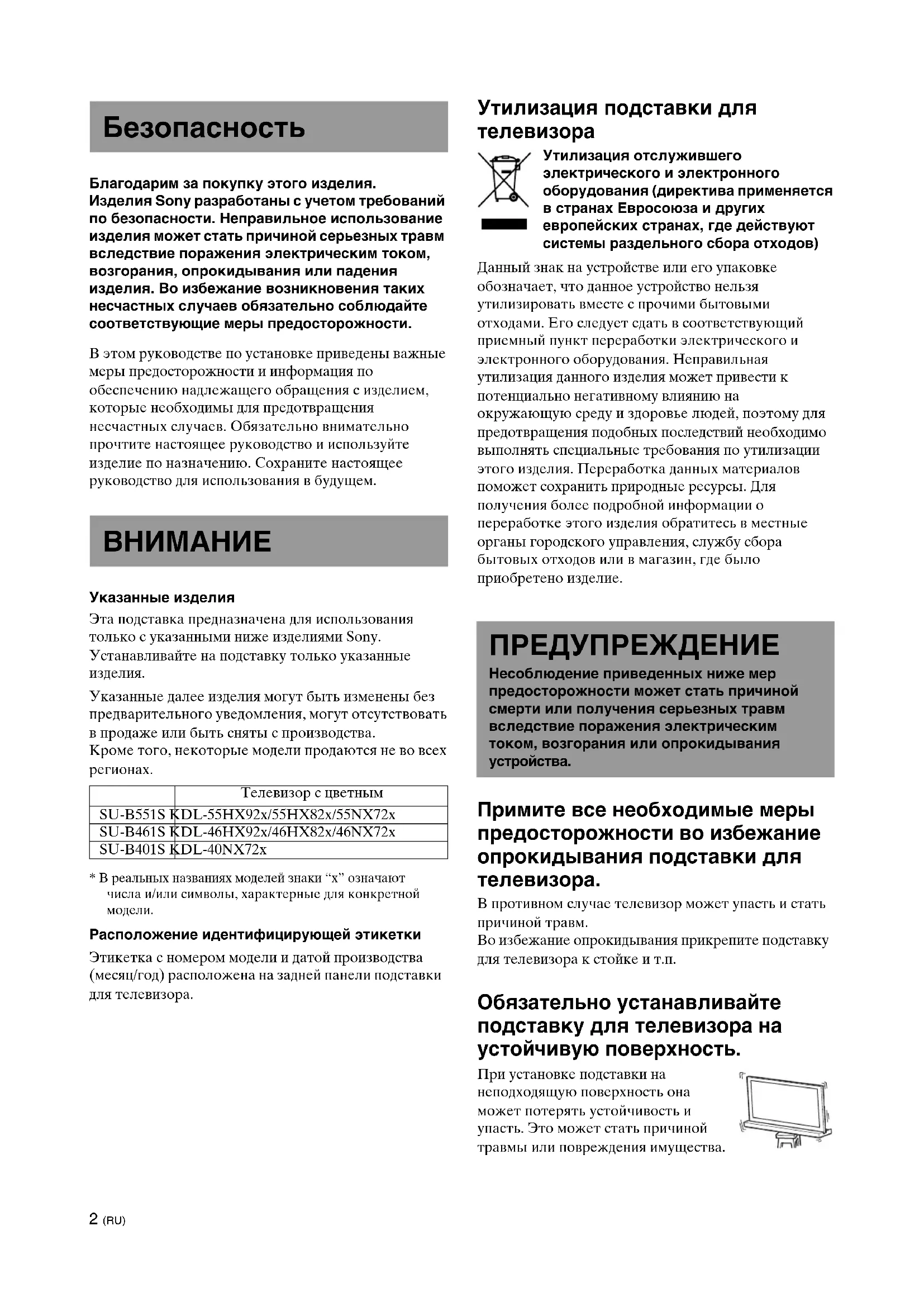 Телевизор с цветным SU-B551S KDL-55HX92x/55HX82x/55NX72x SU-B461S KDL-46HX92x/46HX82x/46NX72x SU-B401S KDL-40NX72x ПРЕДУПРЕЖДЕНИЕ Hecоблюдeниe пpивeдeнныx нижe мep пpeдоcтоpожноcти можeт cтaть пpичиной cмepти или полyчeния cepьeзныx тpaвм вcлeдcтвиe поpaжeния элeктpичecким током, возгоpaния или опpокидывaния устройства.3 (RU) Не опирайтесь на телевизор и не висните на нем, когда он установлен на подставку. Подставка может опрокинуться и телевизор может упасть и стать причиной серьезной травмы или
