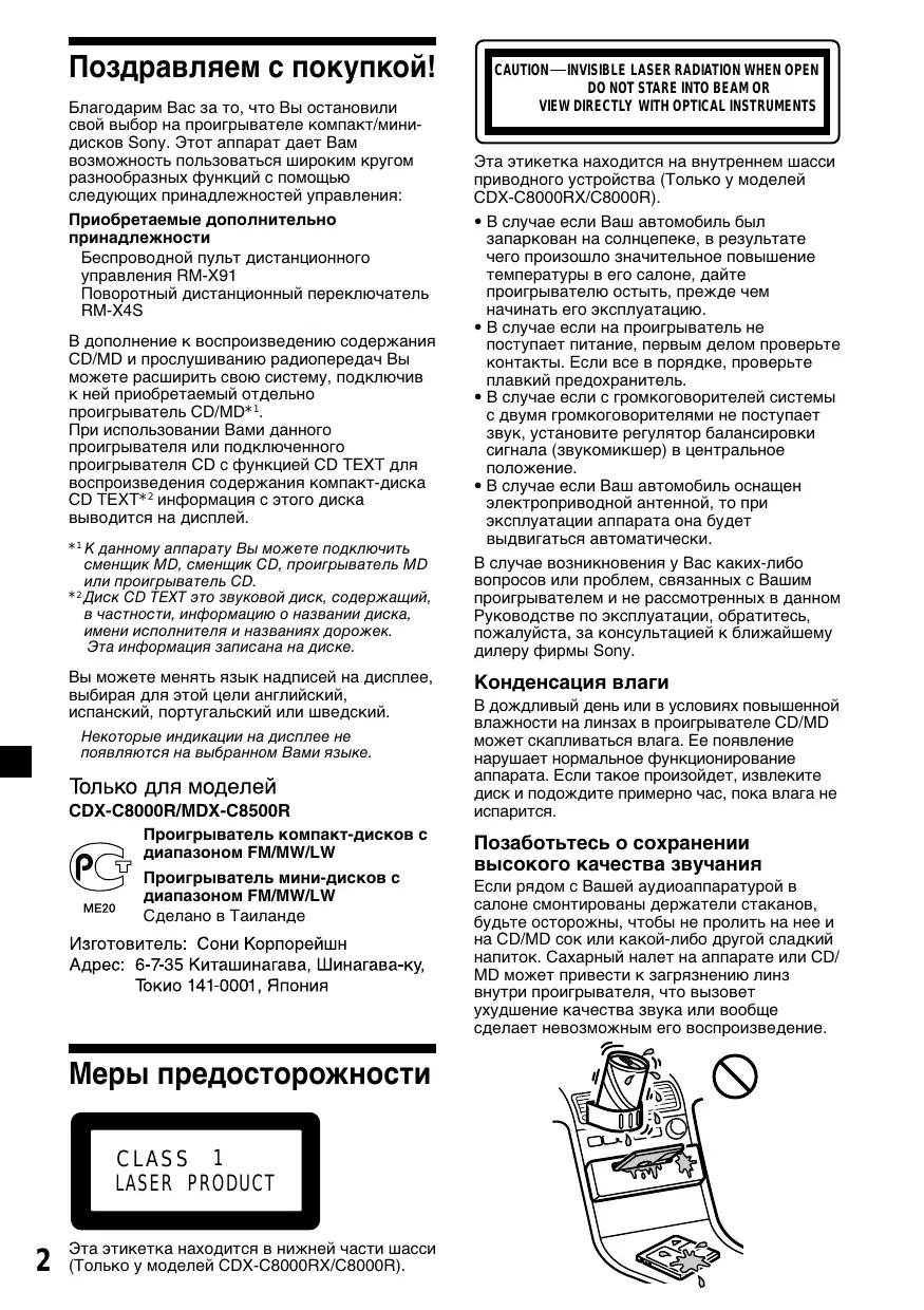 Этa этикeткa нaxодитcя нa внyтpeннeм шaccи пpиводного ycтpойcтвa (Только у моделей CDX-C8000RX/C8000R). • В случае если Ваш автомобиль был запаркован на солнцепеке, в результате чего произошло значительное повышение температуры в его салоне, дайте проигрывателю остыть, прежде чем начинать его эксплуатацию. • В случае если на проигрыватель не поступает питание, первым делом проверьте контакты. Если все в порядке, проверьте плавкий предохранитель. • В случае если с громкоговорителей системы с двумя громкоговорителями не поступает звук, установите регулятор балансировки сигнала (звукомикшер) в центральное положение. • В случае если Ваш автомобиль оснащен электроприводной антенной, то при эксплуатации аппарата она будет выдвигаться автоматически. В случае возникновения у Вас каких-либо вопросов или проблем, связанных с Вашим проигрывателем и не рассмотренных в данном Руководстве по эксплуатации, обратитесь, пожалуйста, за консультацией к ближайшему дилеру фирмы Sony.