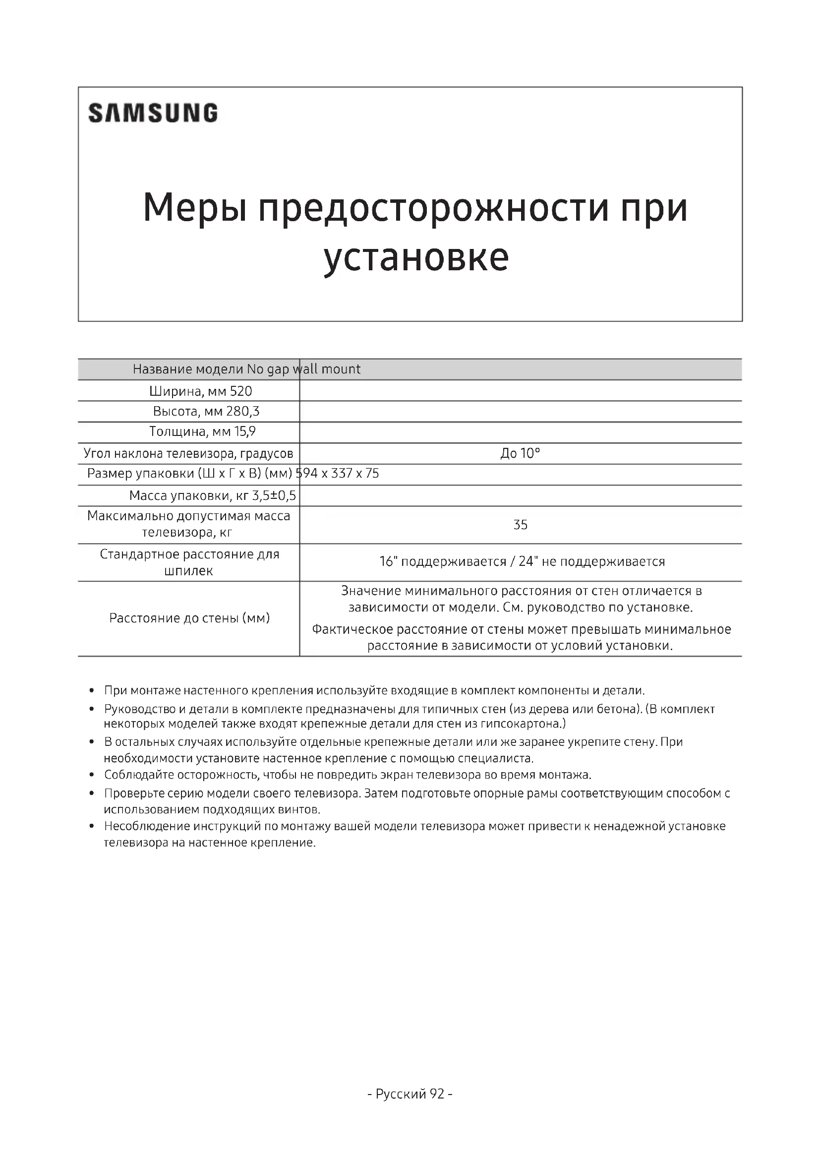 - Чтобы изделие работало оптимальным образом и без неполадок, не выполняйте установку в перечисленных ниже местах. – Места, где могут возникать вибрация и ударные воздействия: изделие может упасть и получить повреждения. – Рядом с противопожарным датчиком: он может среагировать на исходящее от телевизора тепло и запустить оросители. – Рядом с кабелями высокого давления: на работу телевизора и изображение на экране могут влиять помехи от такого кабеля. – Рядом с нагревательными приборами: телевизор может перегреться и выйти из строя. – Выполняйте установку только на вертикальную стену. – Устанавливайте телевизор в недоступных для детей местах. – Не проделывайте выемки и отверстия для установки внутри стены. – Уточните тип и состояние стены, на которую выполняется монтаж. – Выбор используемых материалов зависит от типа стены. При выборе материалов руководствуйтесь приведенными ниже характеристиками. – Использовать все входящие в комплект винты нет необходимости. Минимальное количество используемых винтов– 4шт. – Установка винтов в двух областях, отмеченных на схеме буквой А, является обязательной. – Помимо этого, используйте для крепления не менее двух областей, отмеченных на схеме буквой В, в зависимости от монтажной поверхности. – Для скрытия кабелей внутри стены обратитесь к специалисту-монтажнику.- Українська 98 - - Українська 99 - Застереження щодо встановлення Назва моделі No gap wall mount Ширина (мм) 520 Висота (мм) 280,3 Товщина (мм) 15,9 Нахил телевізора (°) Макс. 10° Розмір упаковки (Ш x Г x В) (мм) 594 x 337 x 75 Вага пакування (кг) 3,5±0,5 Макс. допустима вага телевізора