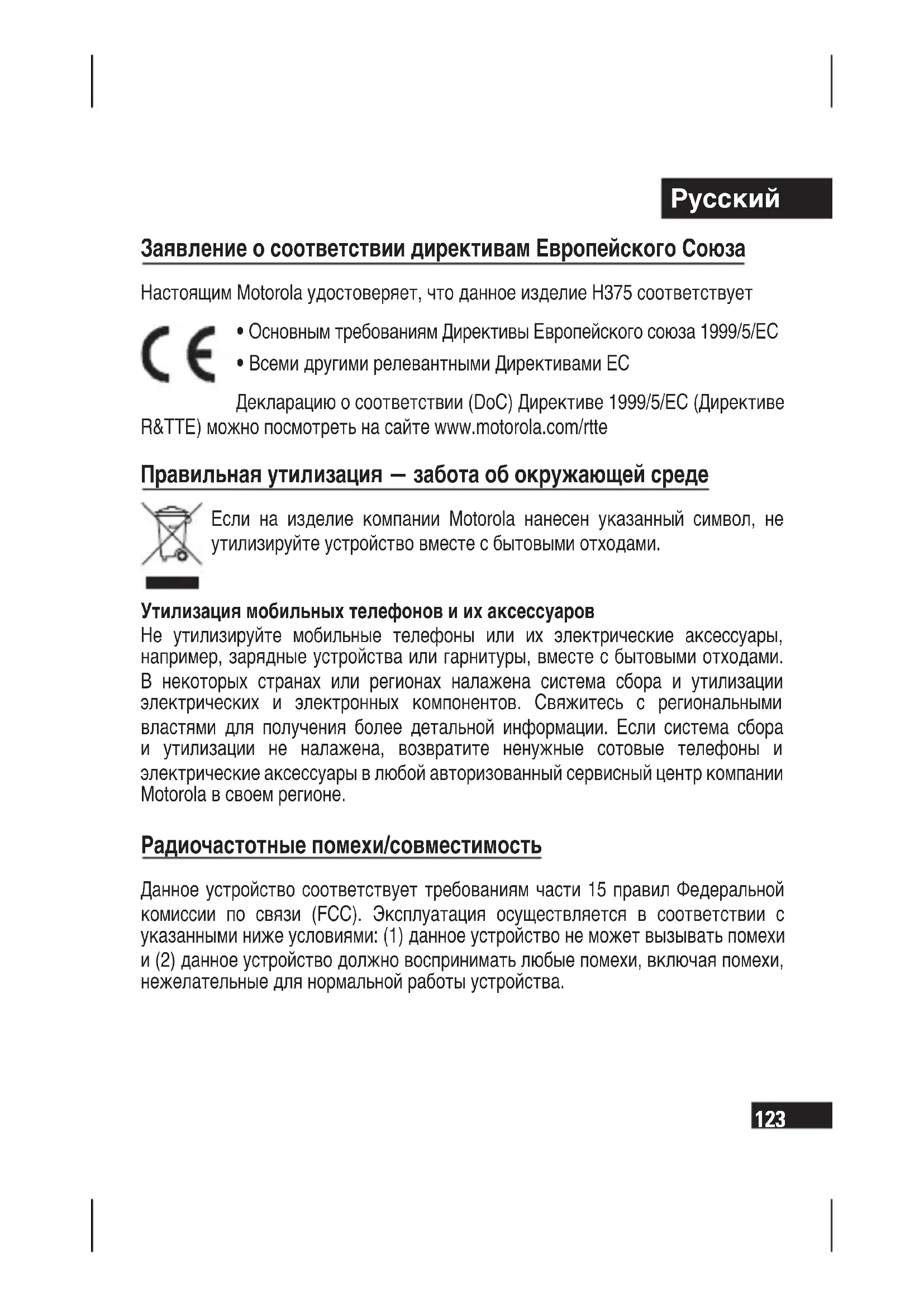 Заявление о соответствии директивам Европейского Союза Настоящим Motorola удостоверяет, что данное изделие H375 соответствует
