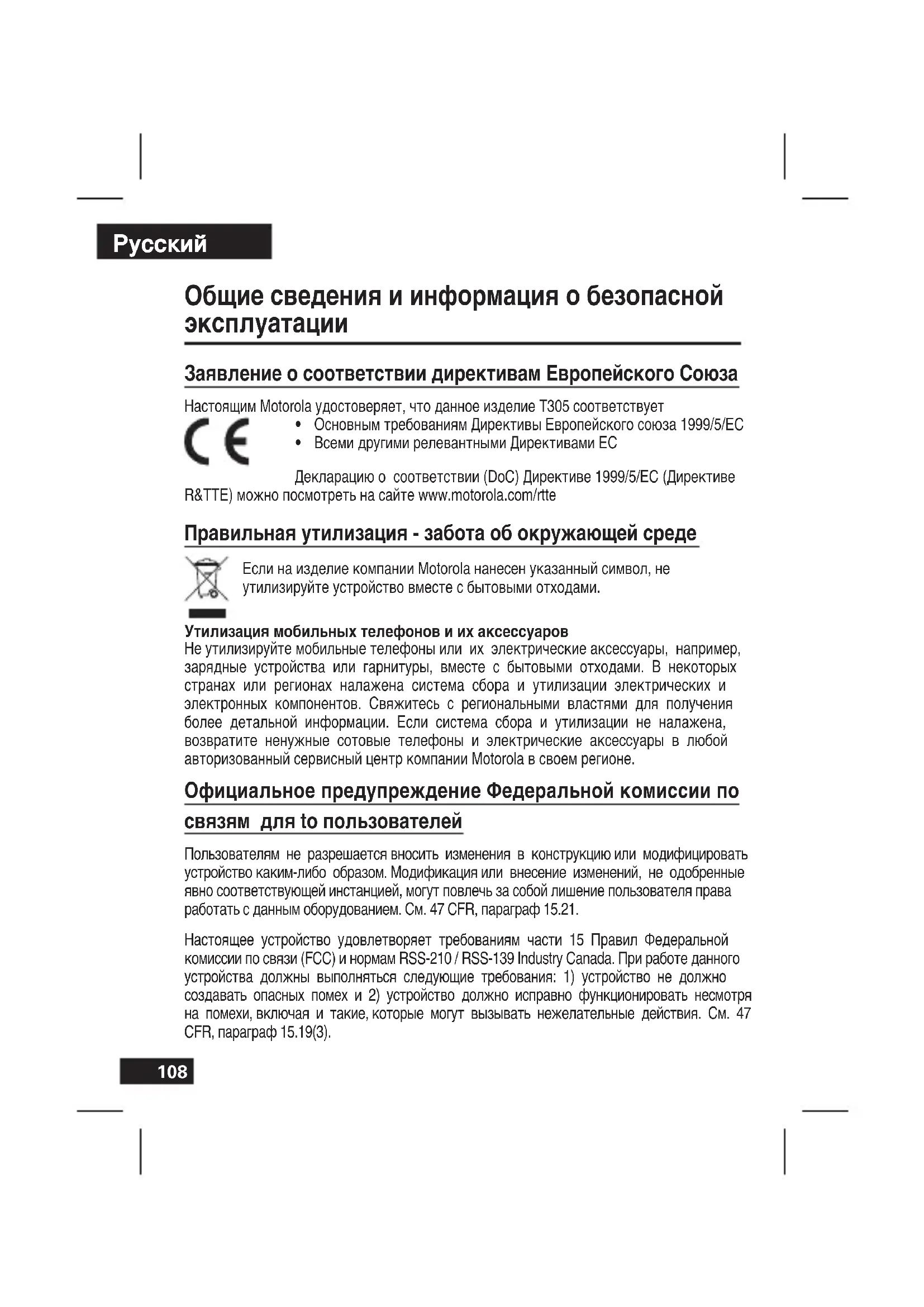 - Всеми другими релевантными Директивами ЕС Декларацию о соответствии (DoC) Директиве 1999/5/EC (Директиве R&TTE) можно посмотреть на сайте www.motorola.com/rtte Правильная утилизация - забота об окружающей среде Если на изделие компании Motorola нанесен указанный символ, не утилизируйте устройство вместе с бытовыми отходами. Утилизация мобильных телефонов и их аксессуаров Не утилизируйте мобильные телефоны или их электрические аксессуары, например, зарядные устройства или гарнитуры, вместе с бытовыми отходами. В некоторых странах или регионах налажена система сбора и утилизации электрических и электронных компонентов. Свяжитесь с региональными властями для получения более детальной информации. Если система сбора и утилизации не налажена, возвратите ненужные сотовые телефоны и электрические аксессуары в любой авторизованный сервисный центр компании Motorola в своем регионе. Официальное предупреждение Федеральной комиссии по связям для to пользователей Пользователям не разрешается вносить изменения в конструкцию или модифицировать устройство каким-либо образом. Модификация или внесение изменений, не одобренные явно соответствующей инстанцией, могут повлечь за собой лишение пользователя права работать с данным оборудованием. См. 47 CFR, параграф 15.21. Настоящее устройство удовлетворяет требованиям части 15 Правил Федеральной комиссии по связи (FCC) и нормам RSS-210 / RSS-139 Industry Canada. При работе данного устройства должны выполняться следующие требования: 1) устройство не должно создавать опасных помех и 2) устройство должно исправно функционировать несмотря на помехи, включая и такие, которые могут вызывать нежелательные действия. См. 47 CFR, параграф 15.19(3).109 Русcкий
