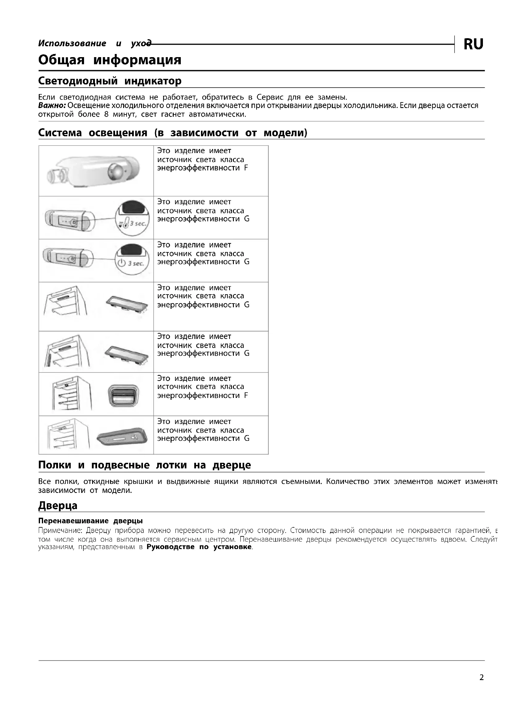 Общая информация Светодиодный индикатор Если светодиодная система не работает, обратитесь в Сервис для ее замены. Важно: Освещение холодильного отделения включается при открывании дверцы холодильника. Если дверца остается открытой более 8 минут, свет гаснет автоматически. Система освещения (в зависимости от модели) Это изделие имеет источник света класса энергоэффективности F Это изделие имеет источник света класса энергоэффективности G Это изделие имеет источник света класса энергоэффективности G Это изделие имеет источник света класса энергоэффективности G Это изделие имеет источник света класса энергоэффективности G Это изделие имеет источник света класса энергоэффективности F Это изделие имеет источник света класса энергоэффективности G Полки и подвесные лотки на дверце Все полки, откидные крышки и выдвижные ящики являются съемными. Количество этих элементов может изменяться в зависимости от модели.