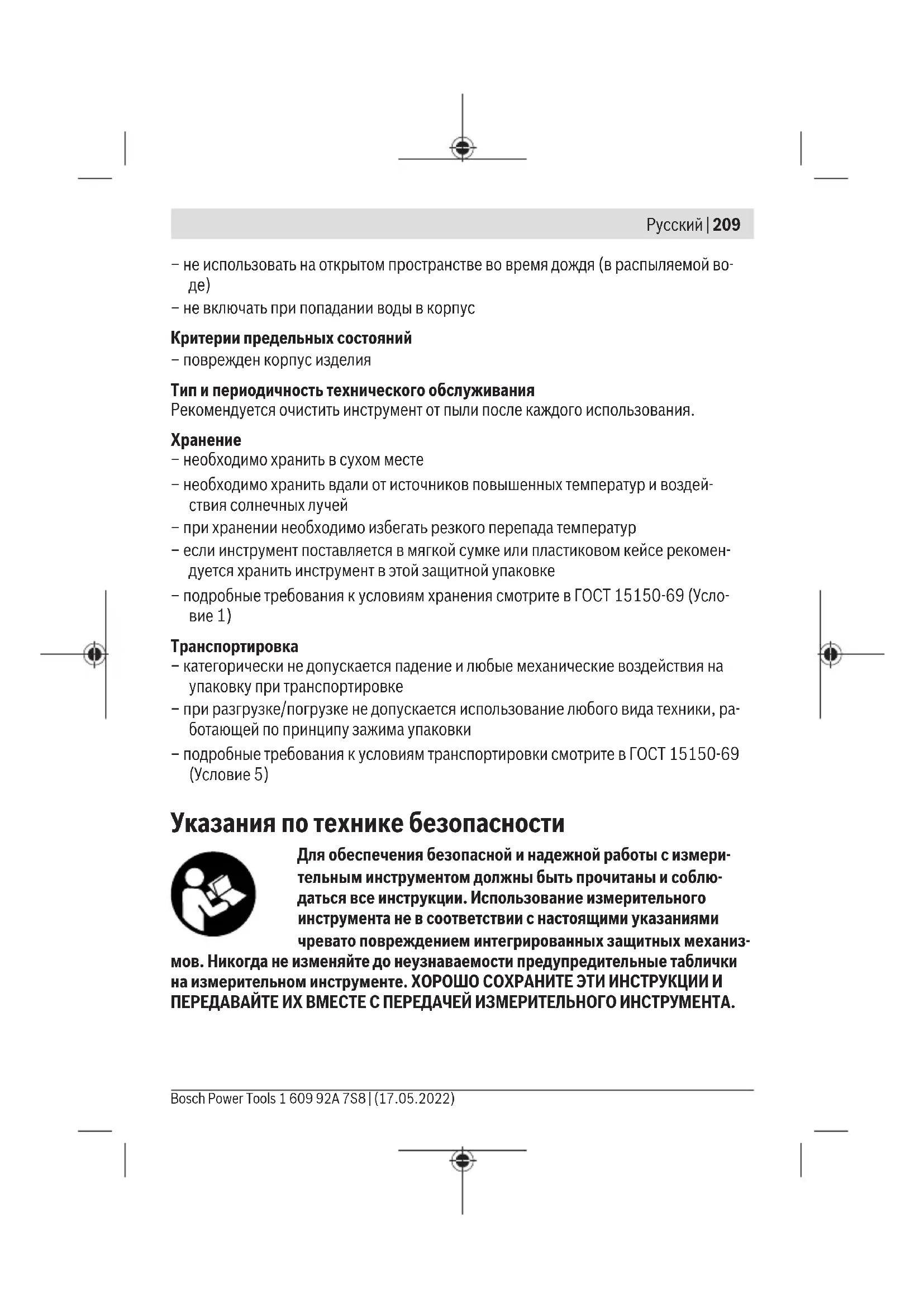 – необходимо хранить в сухом месте – необходимо хранить вдали от источников повышенных температур и воздей- ствия солнечных лучей – при хранении необходимо избегать резкого перепада температур – если инструмент поставляется в мягкой сумке или пластиковом кейсе рекомен- дуется хранить инструмент в этой защитной упаковке – подробные требования к условиям хранения смотрите в ГОСТ 15150-69 (Усло- вие 1) Транспортировка – категорически не допускается падение и любые механические воздействия на упаковку при транспортировке – при разгрузке/погрузке не допускается использование любого вида техники, ра- ботающей по принципу зажима упаковки – подробные требования к условиям транспортировки смотрите в ГОСТ 15150-69 (Условие 5) Указания по технике безопасности Для обеспечения безопасной и надежной работы с измери- тельным инструментом должны быть прочитаны и соблю- даться все инструкции. Использование измерительного инструмента не в соответствии с настоящими указаниями чревато повреждением интегрированных защитных механиз- мов. Никогда не изменяйте до неузнаваемости предупредительные таблички на измерительном инструменте. ХОРОШО СОХРАНИТЕ ЭТИ ИНСТРУКЦИИ И ПЕРЕДАВАЙТЕ ИХ ВМЕСТЕ С ПЕРЕДАЧЕЙ ИЗМЕРИТЕЛЬНОГО ИНСТРУМЕНТА. Bosch Power Tools 1 609 92A 7S8 | (17.05.2022)210 | Русский u Осторожно – применение инструментов для обслуживания или юстировки или процедур техобслуживания, кроме указанных здесь, может привести к опасному воздействию излучения. u Измерительный инструмент поставляется с предупредительной табличкой лазерного излучения (показана на странице с изображением измерительно- го инструмента). u Если текст предупредительной таблички лазерного излучения не на Вашем родном языке, перед первым запуском в эксплуатацию заклейте ее наклей- кой на Вашем родном языке, которая входит в объем поставки. Не направляйте луч лазера на людей или животных и сами не смотрите на прямой или отражаемый луч лазера. Этот луч мо- жет слепить людей, стать причиной несчастного случая или повре- дить глаза. u В случае попадания лазерного луча в глаз глаза нужно намеренно закрыть и немедленно отвернуться от луча. u Не меняйте ничего в лазерном устройстве. u Не используйте очки для работы с лазерным инструментом (принадлеж- ность) в качестве защитных очков. Очки для работы с лазерным инструментом обеспечивают лучшее распознавание лазерного луча, но не защищают от лазер- ного излучения. u Не используйте очки для работы с лазерным инструментом (принадлеж- ность) в качестве солнцезащитных очков или за рулем. Очки для работы с ла- зером не обеспечивают защиту от УФ-излучения и мешают правильному цвето- восприятию. u Ремонт измерительного инструмента разрешается выполнять только квали- фицированному персоналу и только с использованием оригинальных запча- стей. Этим обеспечивается безопасность измерительного инструмента. u Не позволяйте детям пользоваться лазерным измерительным инструмен- том без присмотра. Дети могут по неосторожности ослепить себя или посто- ронних людей. u Не работайте с измерительным инструментом во взрывоопасной среде, по- близости от горючих жидкостей, газов и пыли. В измерительном инструменте могут образоваться искры, от которых может воспламениться пыль или пары. 1 609 92A 7S8 | (17.05.2022) Bosch Power ToolsРусский | 211 Не устанавливайте магнит вблизи имплантант