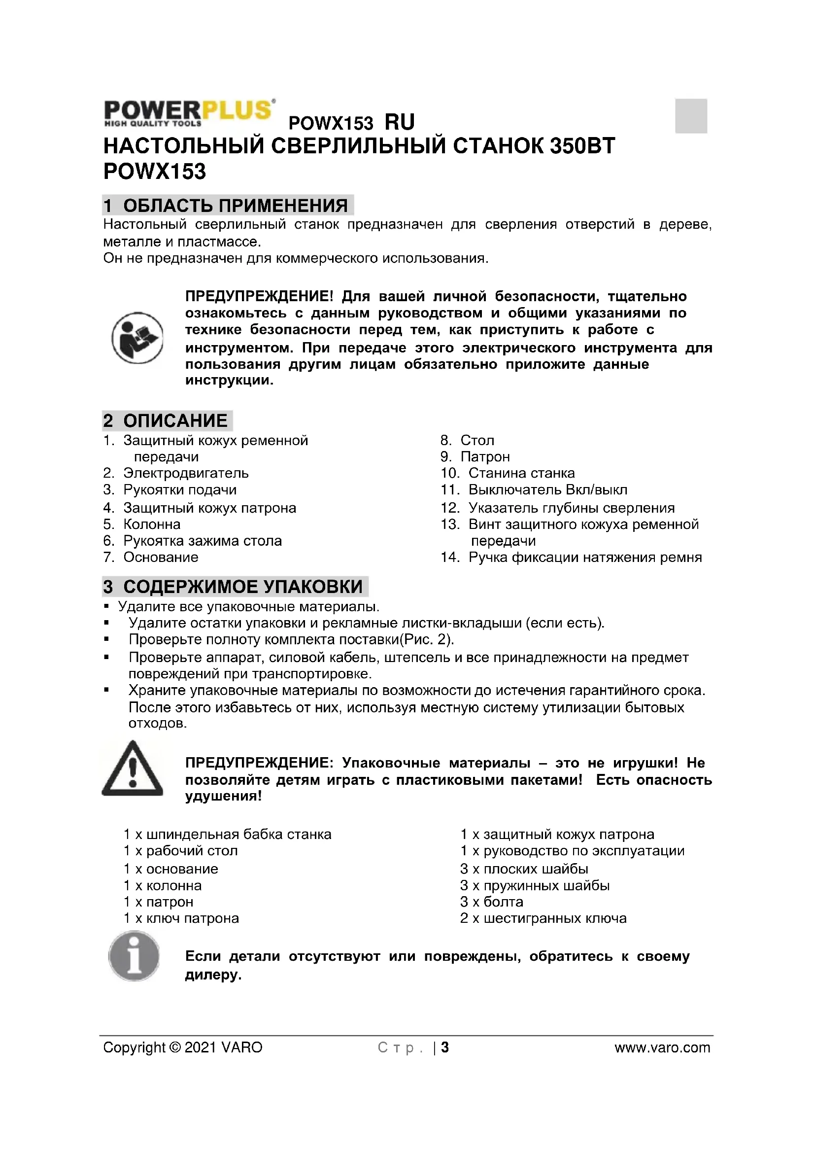 - 17 ДЕКЛАРАЦИЯ О СООТВЕТСТВИИ POWX153 RU Copyright © 2021 VARO С т р . | 3 www.varo.com НАСТОЛЬНЫЙ СВЕРЛИЛЬНЫЙ СТАНОК 350BT POWX153 1 ОБЛАСТЬ ПРИМЕНЕНИЯ Настольный сверлильный станок предназначен для сверления отверстий в дереве, металле и пластмассе. Он не предназначен для коммерческого использования. ПРЕДУПРЕЖДЕНИЕ! Для вашей личной безопасности, тщательно ознакомьтесь с данным руководством и общими указаниями по технике безопасности перед тем, как приступить к работе с инструментом. При передаче этого электрического инструмента для пользования другим лицам обязательно приложите данные инструкции. 2 ОПИСАНИЕ p. 17